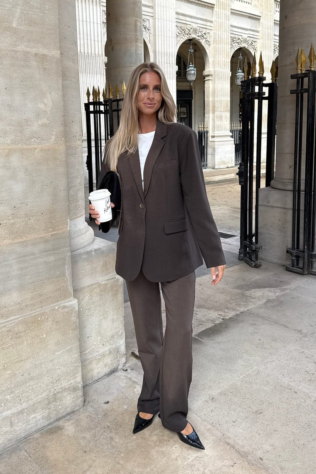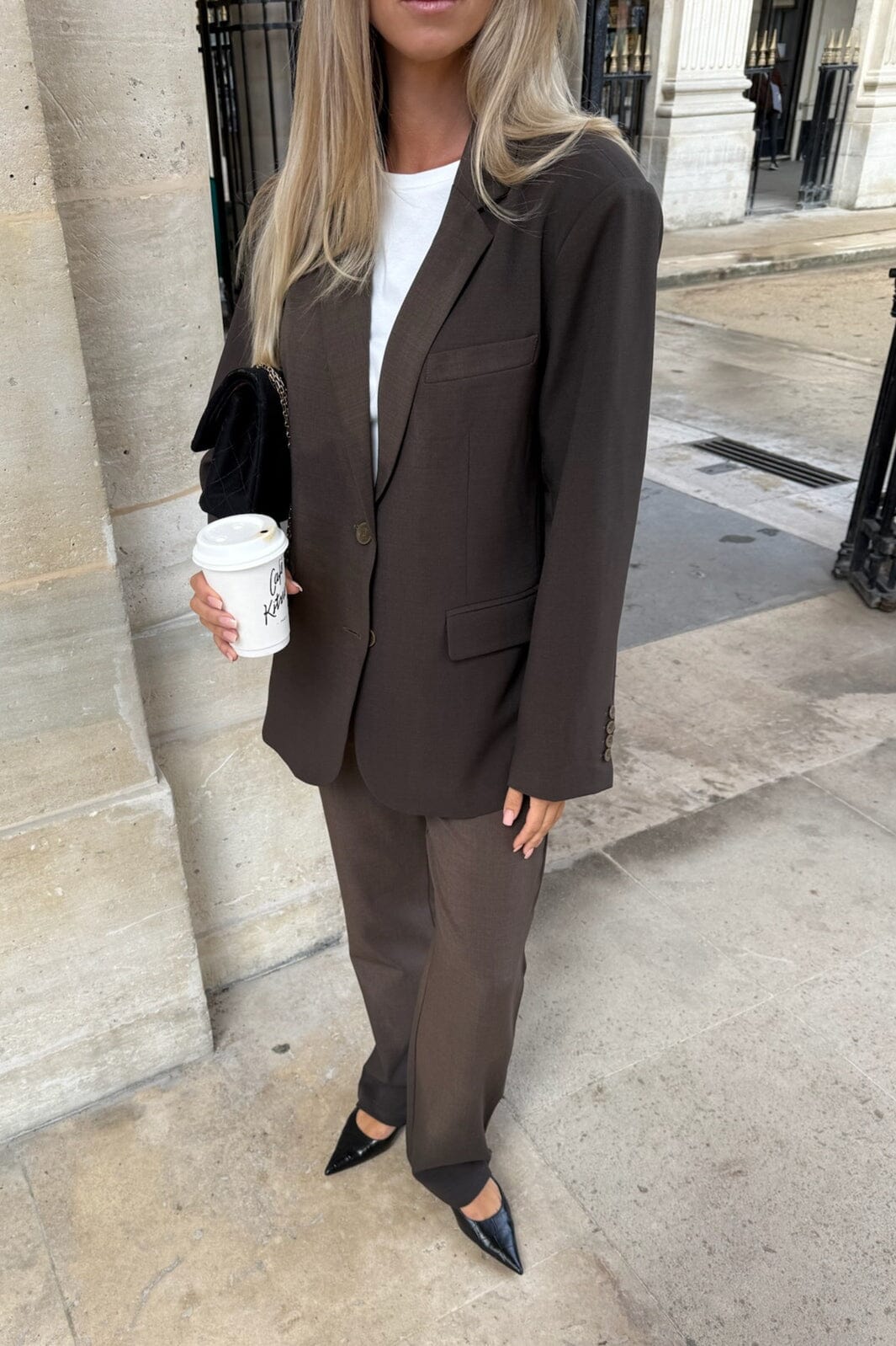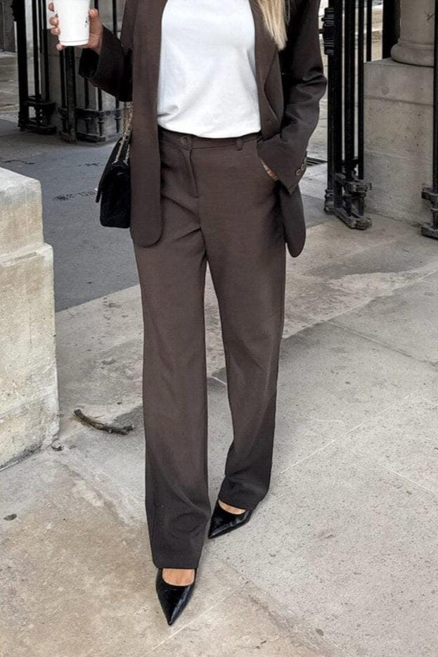Tummanruskeat housut BYIC:ltä suoran leikkauksen ja korkean vyötärön kanssa. Housuissa on vyölenkit vyötäröllä sekä nappi- ja vetoketjukiinnitys edessä.