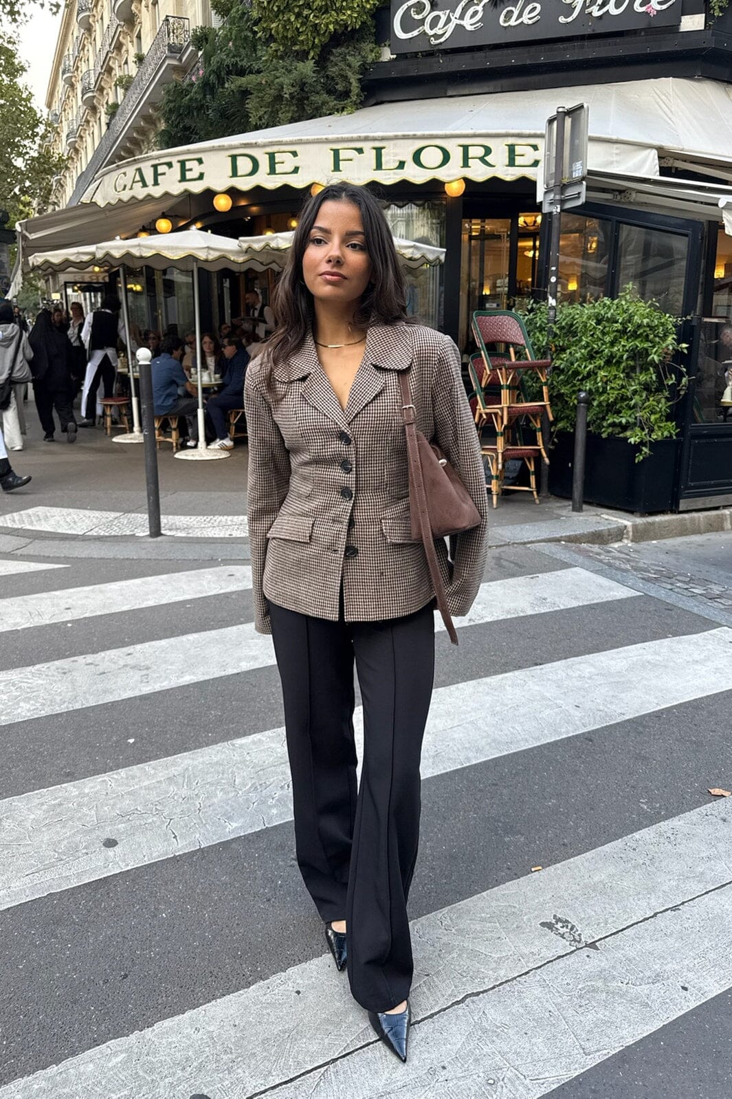 Mustat housut BYIC:ltä, joissa on puristuskaitale edessä. Housuissa on korkea vyötärö, jossa on vyölenkit ja taskut sekä edessä että takana. Koristeelliset saumat antavat housuille huolitellun ilmeen.