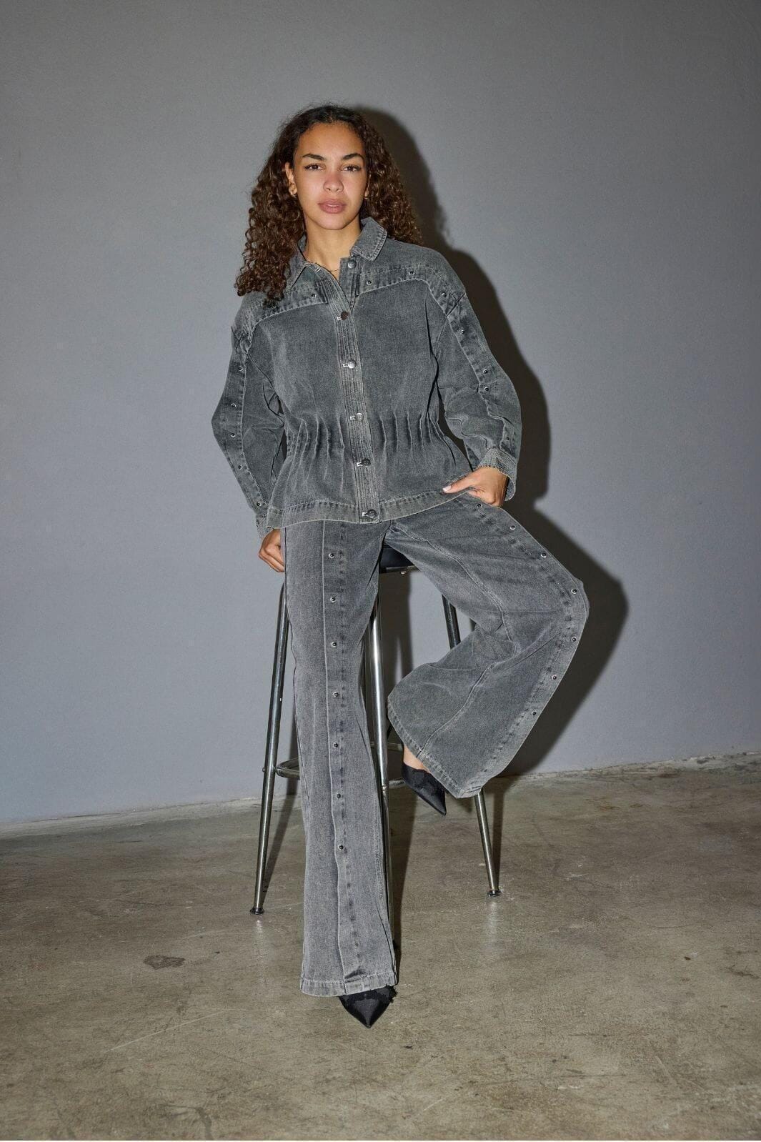 Co'Couturen farkut keskiharmaana. Niissä on korkea vyötärö ja väljä istuvuus suorilla lahkeilla.