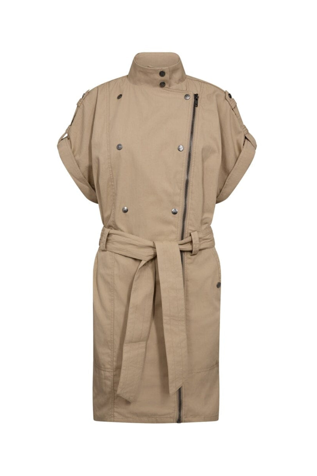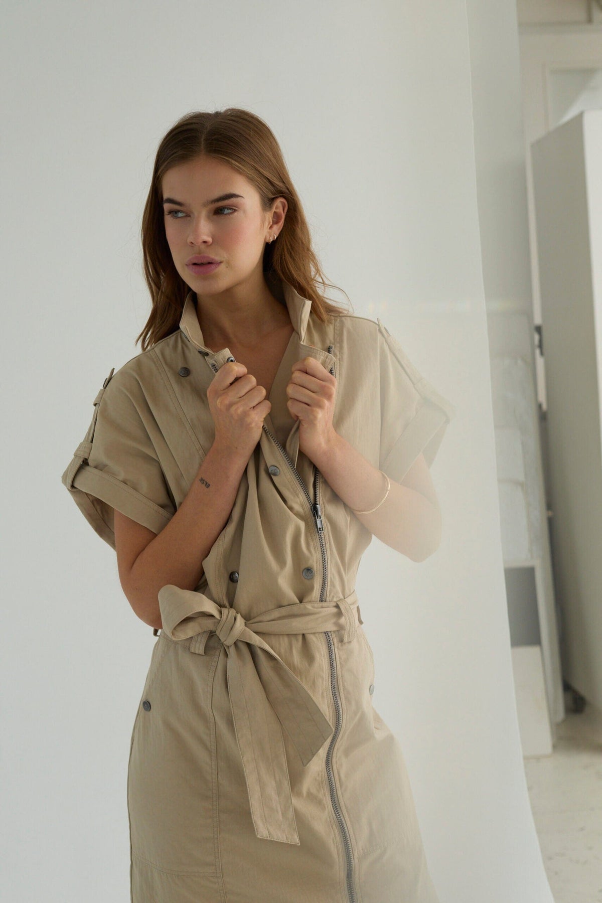 Beige mekko Co´Couturelta, valmistettu puuvillasekoitteesta. Mekossa on korkea kaulus, lyhyet hihat ja vyötärövyö samasta kankaasta.