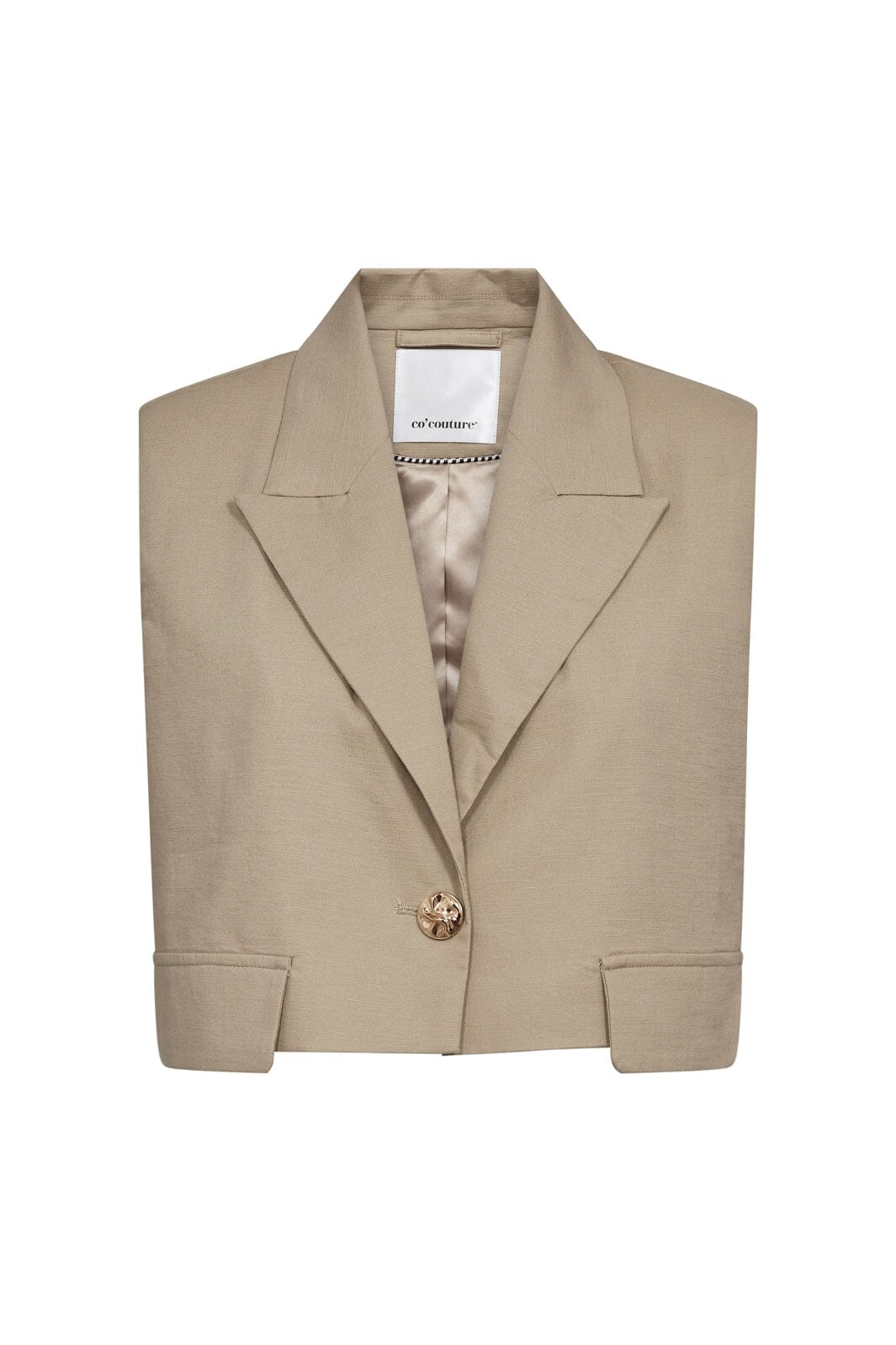 Cropped-liivi Co´Couturelta beigeä. Liivissä on yksi nappikiinnitys edessä ja klassinen lovellinen kauluskäänne.