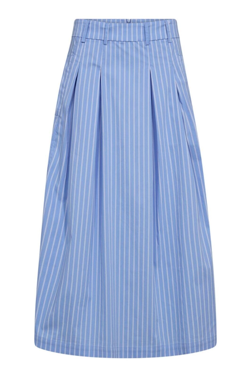 Vaaleansininen pliseerattu hame Co'Couturelta, jossa on valkoisia raitoja. Hame on midi-pituinen ja varustettu vetoketjulla ja napilla vyötäröllä.