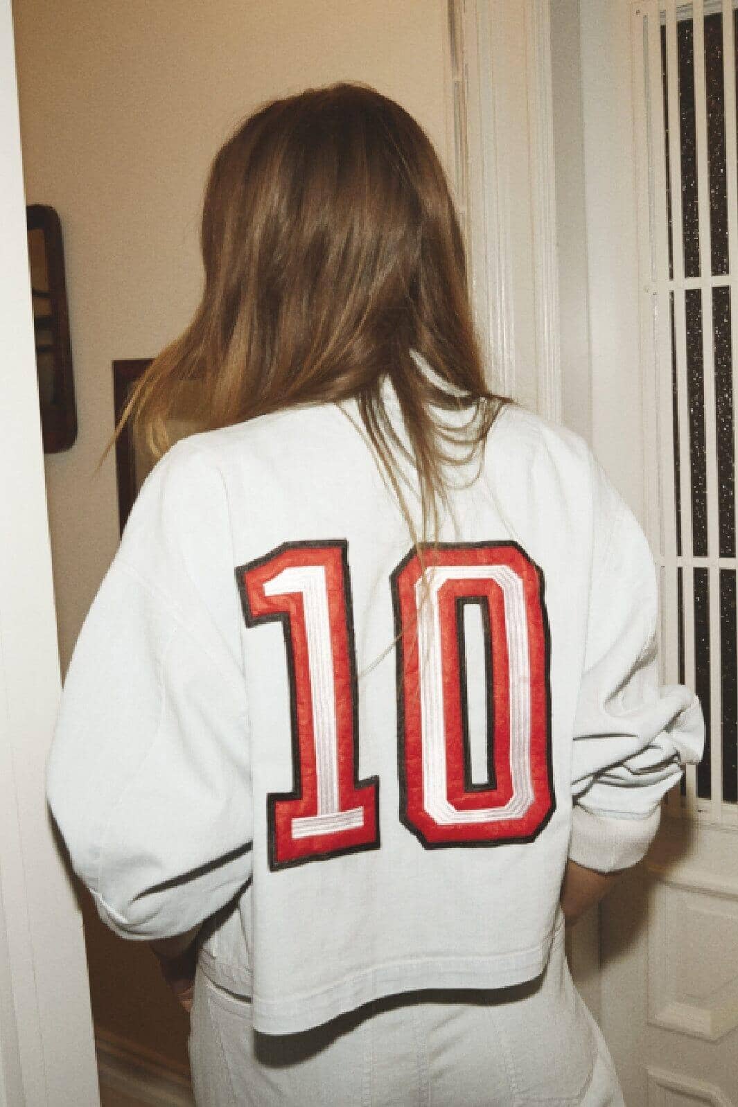 Denim-bomberi Co´Couturelta vaaleassa, haalistuneessa denimvärissä. Lyhyt malli, jossa on suuri numero 10 selässä punaisena ja valkoisena.
