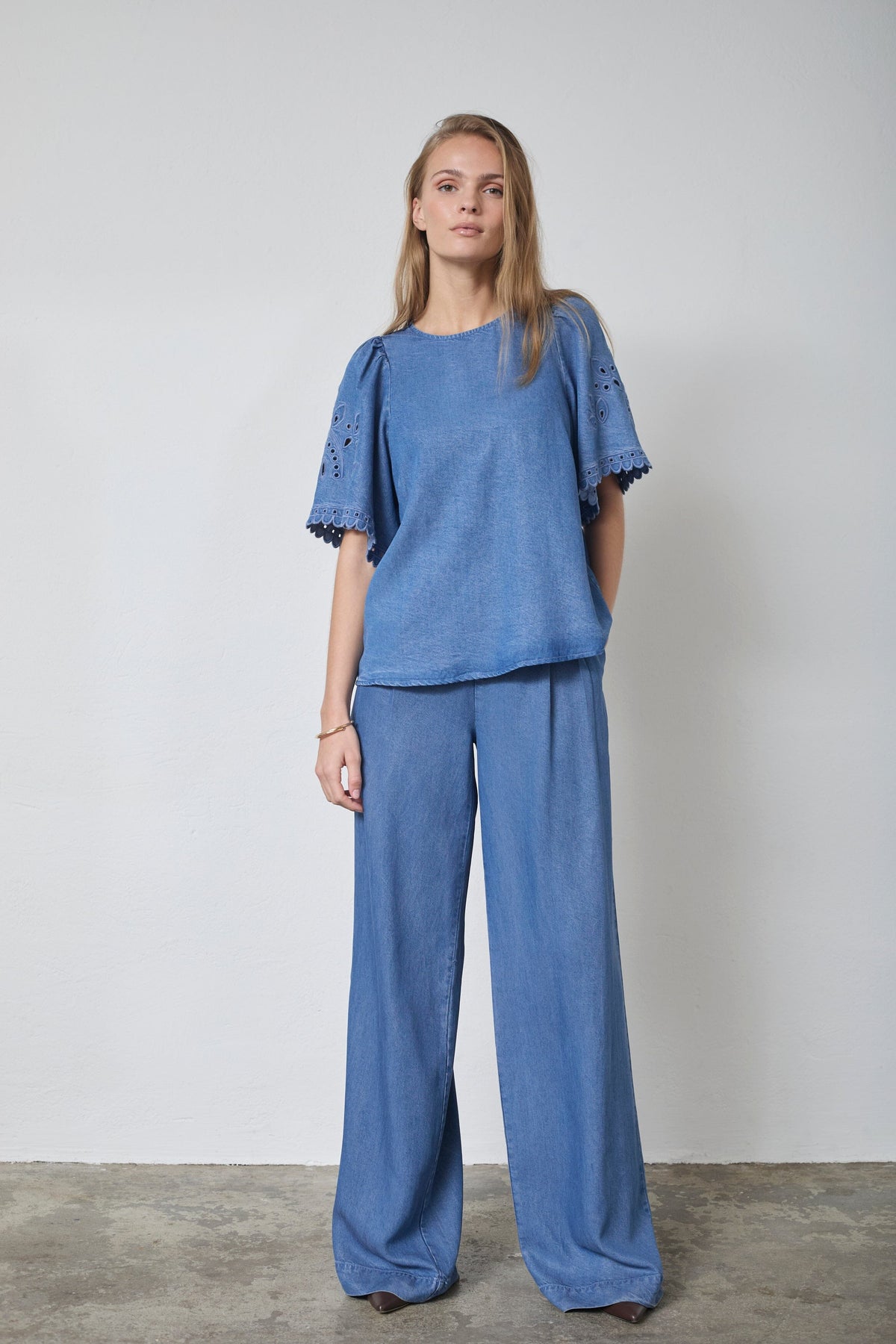 Sininen pusero Co´Couturelta, valmistettu 100 % lyocellista. Puserossa on brodeeratut yksityiskohdat hihoissa ja aaltoileva helma.