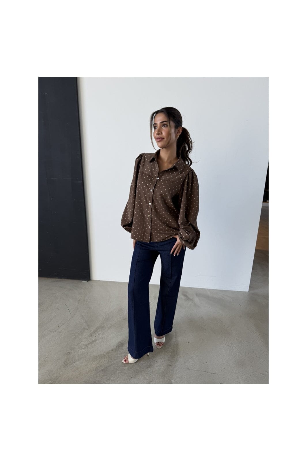 Ruskea pusero Continue-merkkiseltä, jossa on pilkkukuosi. Puserossa on pallomaiset hihat ja klassinen kauluspaita, jossa on valkoiset napit. Se on ommeltu polyesteristä ja siinä on normaali istuvuus.