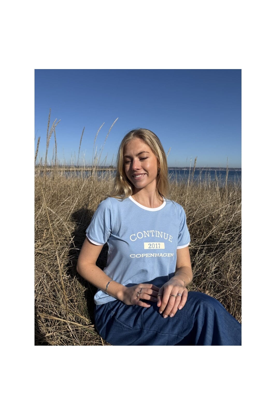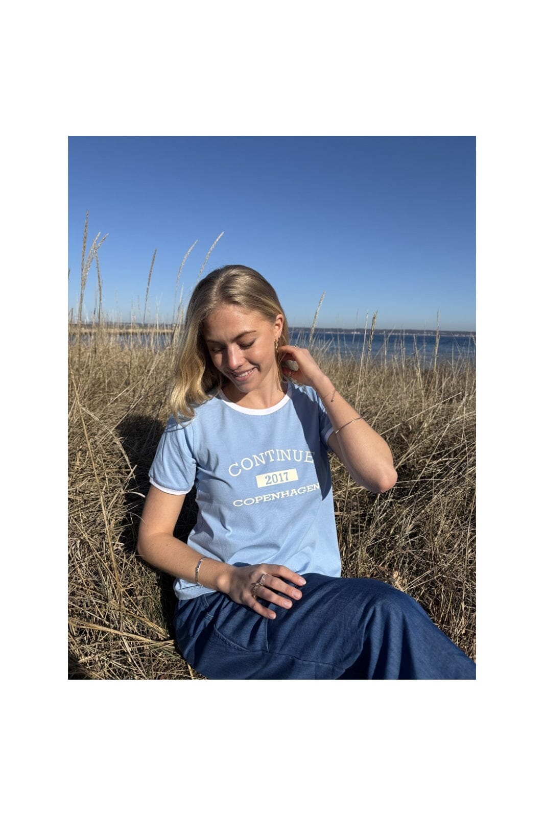 Vaaleansininen Continue-merkin T-paita, jossa on valkoiset reunat pääntiessä ja hihoissa. Edessä on painatus tekstillä CONTINUE 2017 COPENHAGEN.