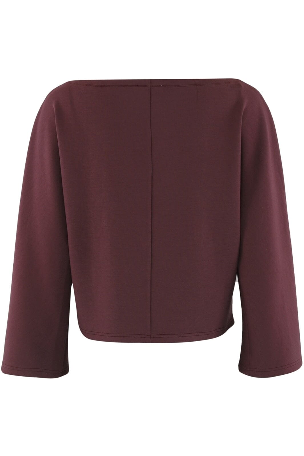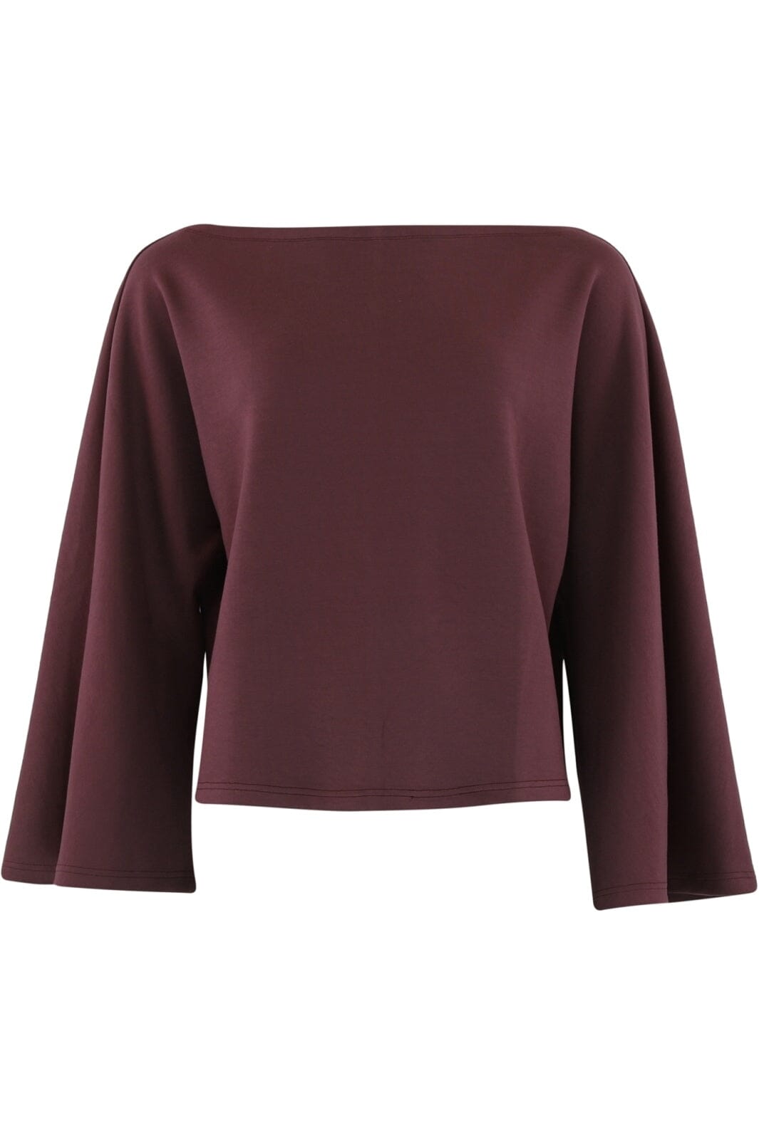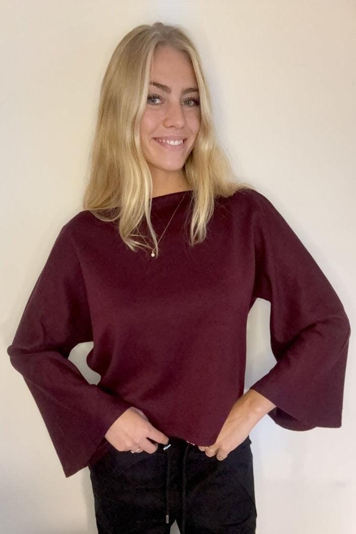 Bordeaux’nvärinen pusero Continuelta rennolla mitoituksella. Puserossa on 3/4-hihat ja yksivärinen pinta.