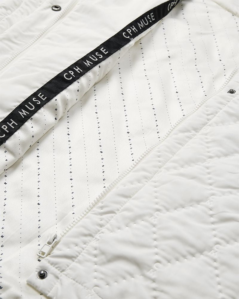 Valkoinen tikattu viitta Copenhagen Muse -merkiltä, valmistettu polyesteristä. Viitassa on rakenteellinen timanttikuvio ja korkea kaulus, jossa on painonapit.