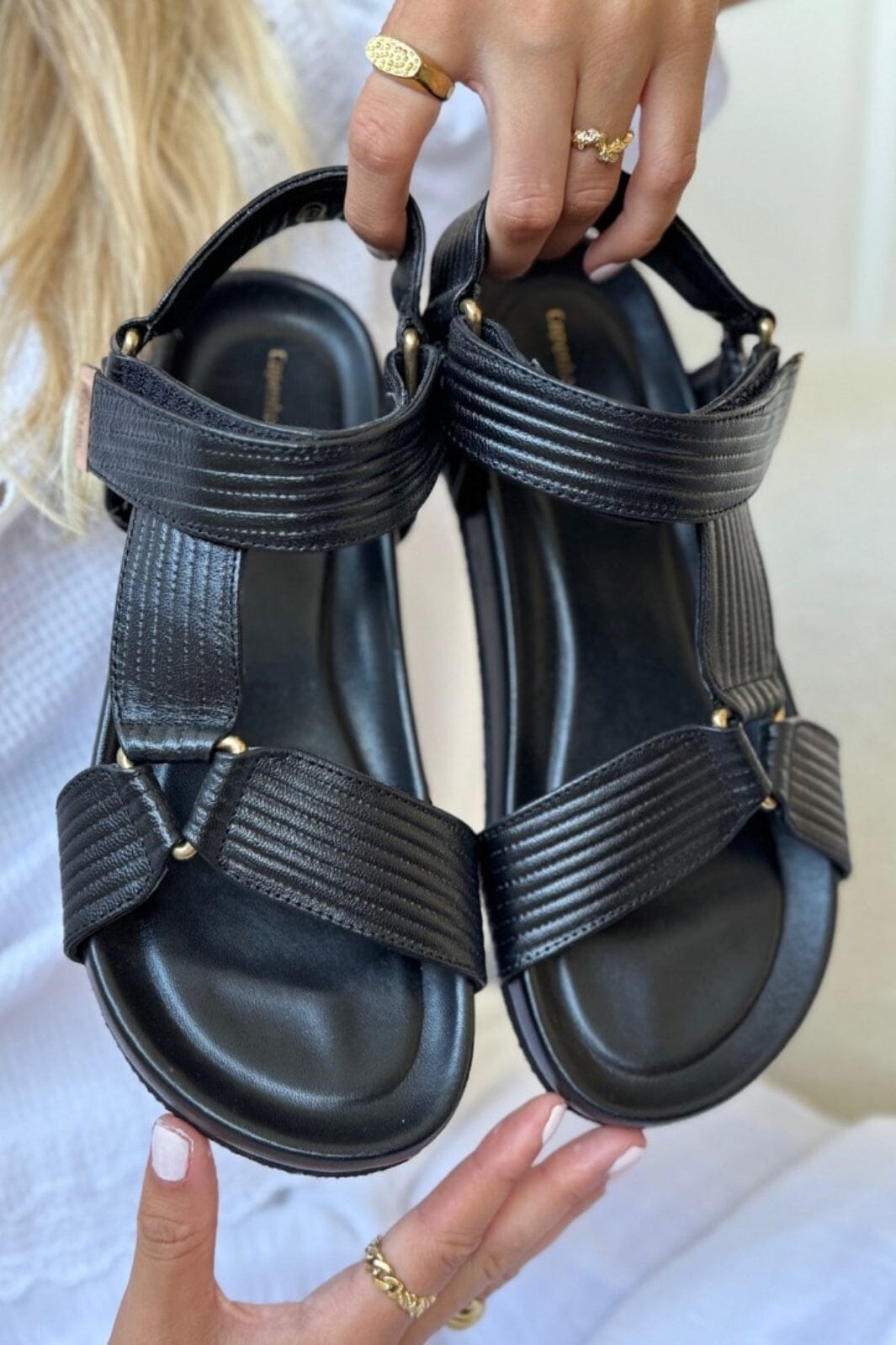 Musta sandaalit Copenhagen Shoesilta pehmeästä nahasta, jossa on uritetut hihnat. Sandaalissa on pehmeä sisäpohja ja joustavat pohjat, jotka tarjoavat hyvää tukea jalalle.