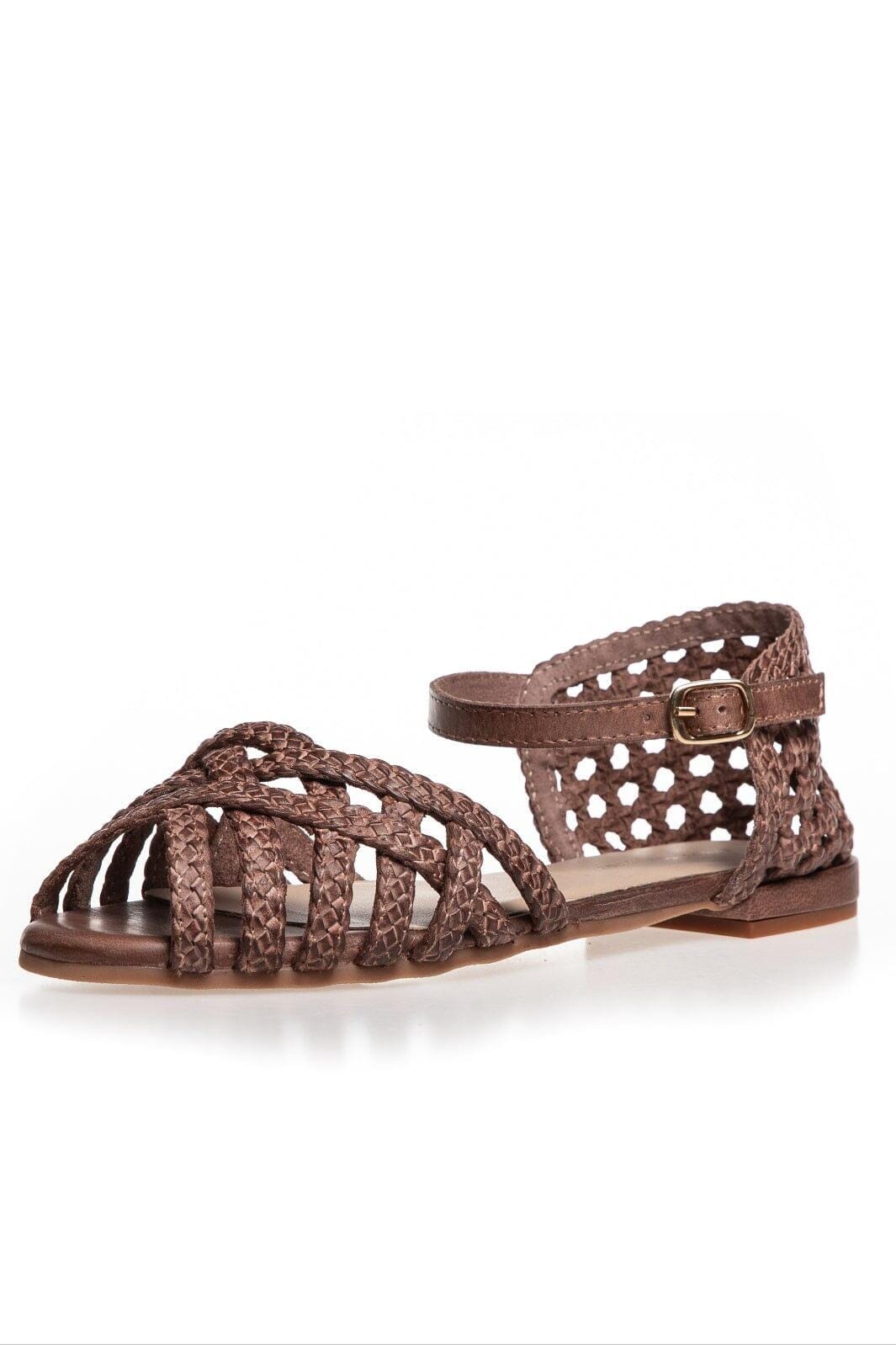 Ruskeat sandaalit Copenhagen Shoesilta, valmistettu nahasta. Sandaalissa on punottu muotoilu ja nilkkaremmi soljella.