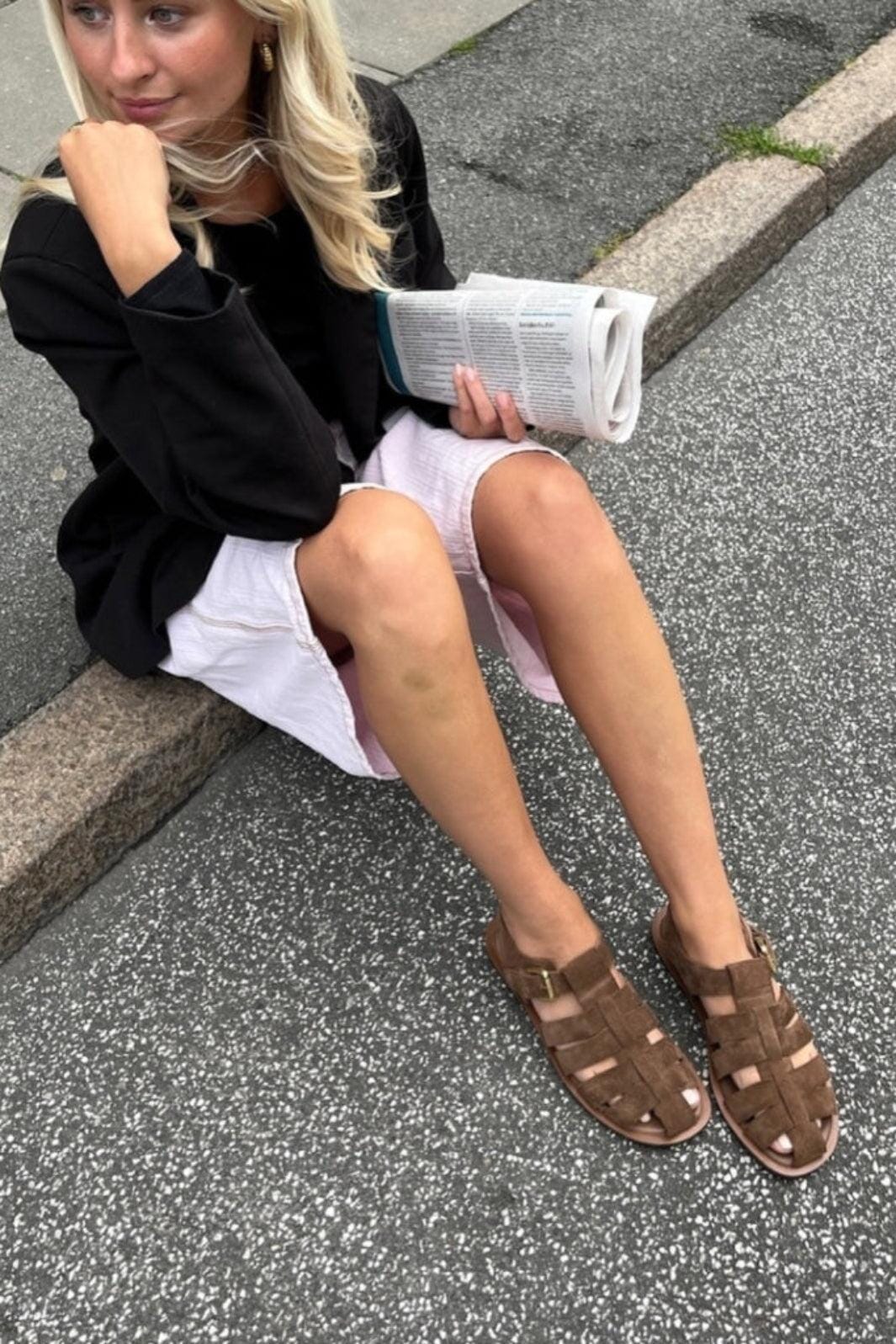 Ruskeat sandaalit Copenhagen Shoes -merkiltä, valmistettu mokkanahasta. Sandaaleissa on useita remmejä päkiän päällä ja säädettävä solki sivulla.