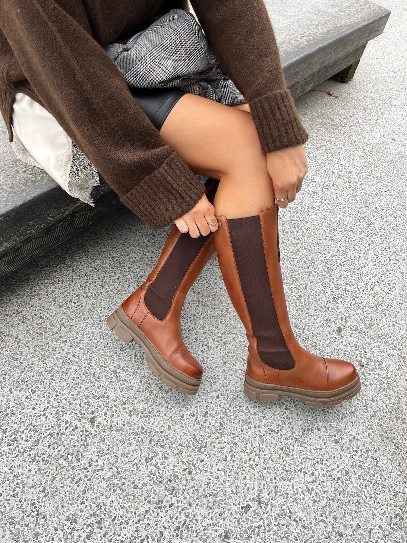 Polven yli ulottuvat saappaat konjakinvärisestä nahasta, joissa on tummat elastiset paneelit sivuilla. TPR-pohja on chunky-muotoinen, mikä tarjoaa hyvää tukea jalalle.