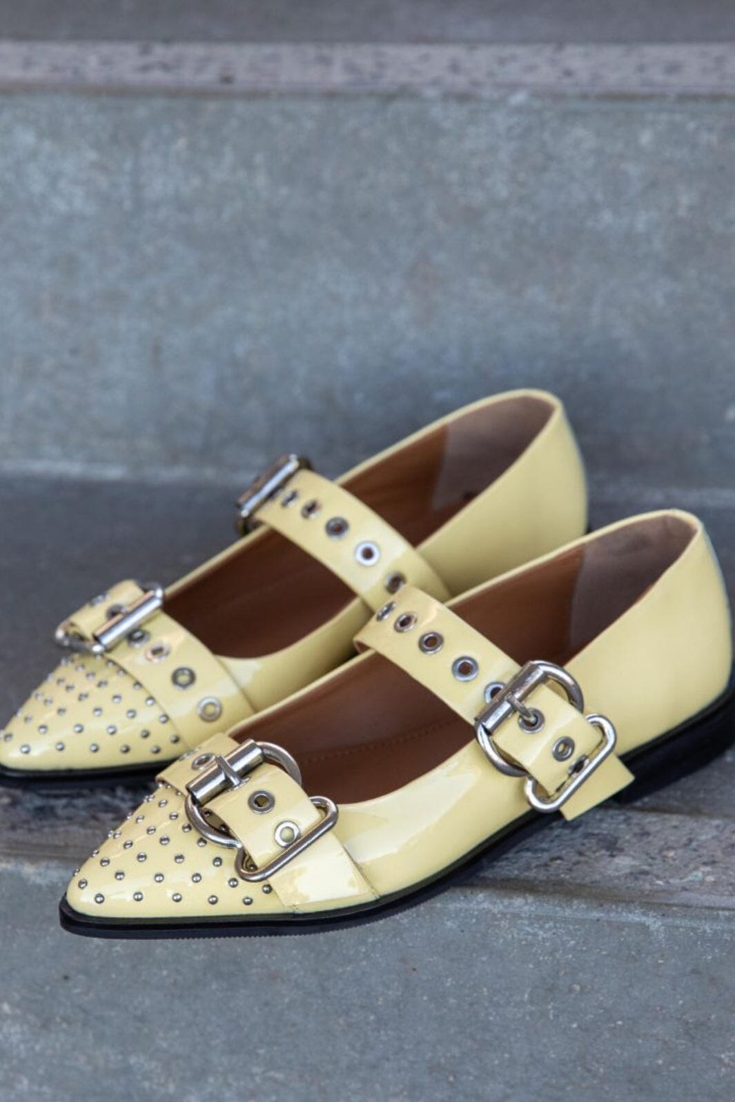 Keltainen ballerina Copenhagen Shoesilta, jossa on lakka viimeistely. Teräväkärkiset kengät, joissa on niittejä varpaissa ja solki nilkassa, antavat voimakkaan ilmeen.