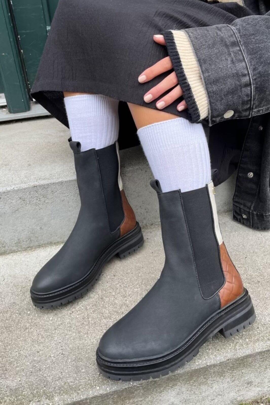 Nahkasaappaat Copenhagen Shoesilta mustalla, ruskealla ja beigen värikombinaatiolla. Saappaissa on lohkokorko ja joustava sulkeminen sivuilla.