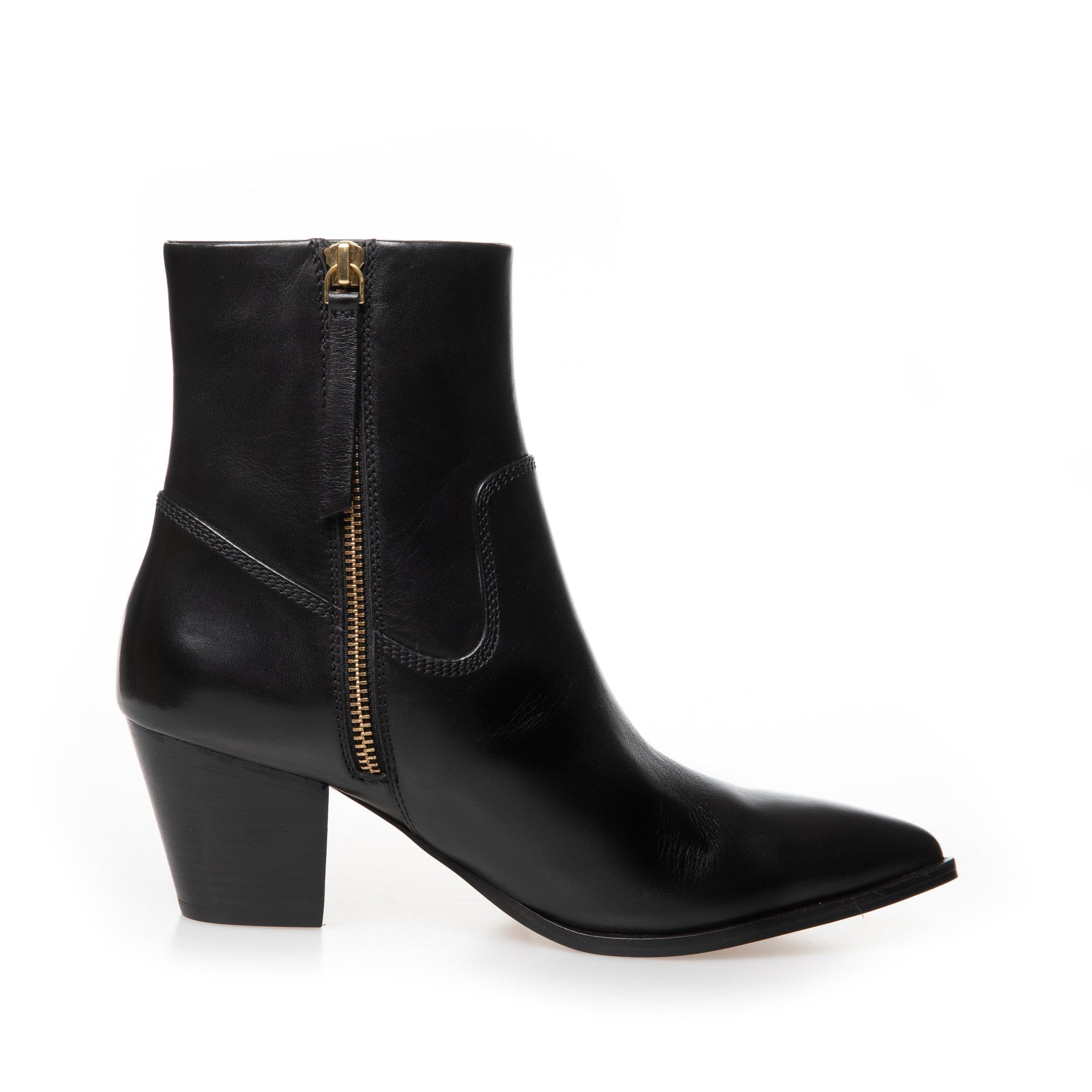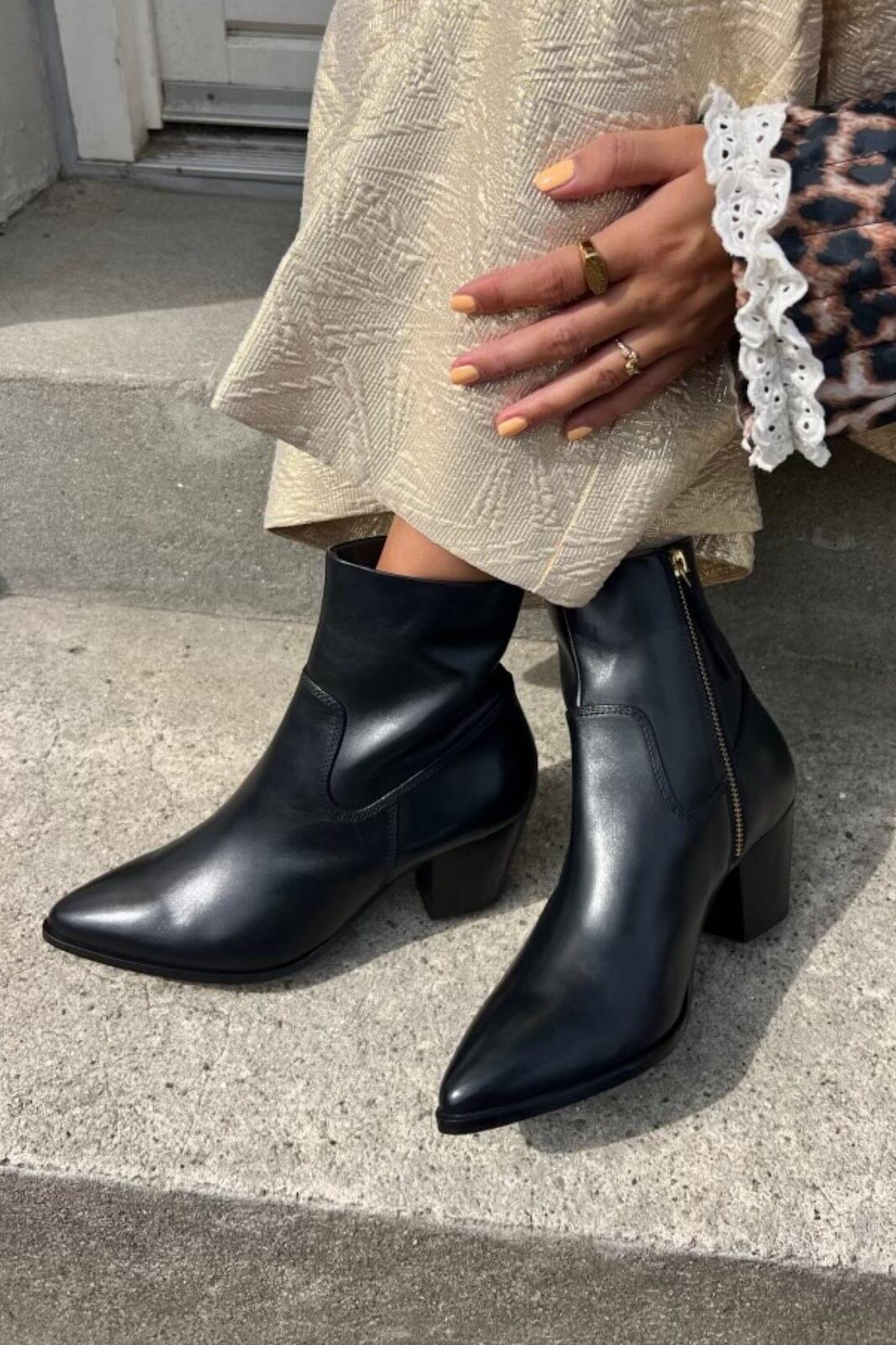 Musta nilkkuri Copenhagen Shoesilta nahasta, jossa on terävä kärki. Kengässä on lohkokorko ja vetoketju sivussa.