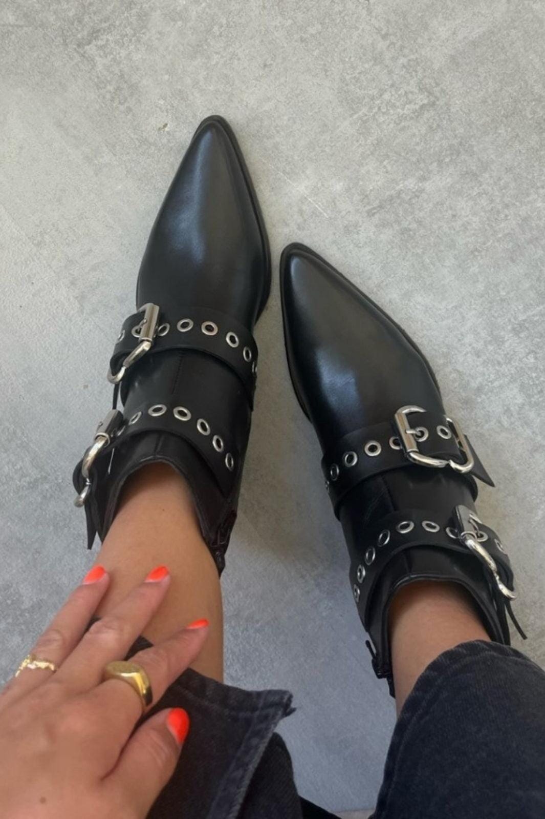 Musta nahkasaappaat teräväkärkisellä varrella. Saappaissa on koristeelliset hihnat metallisoljilla ja silmukoilla sekä käytännöllinen vetoketju sivussa.