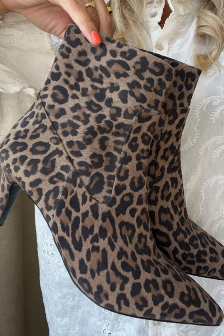 Nilkkurit Copenhagen Shoesilta mokkaa leopardikuosilla. Kengässä on terävä kärki, vetoketju sisäpuolella ja 5-8 cm korkea korko.