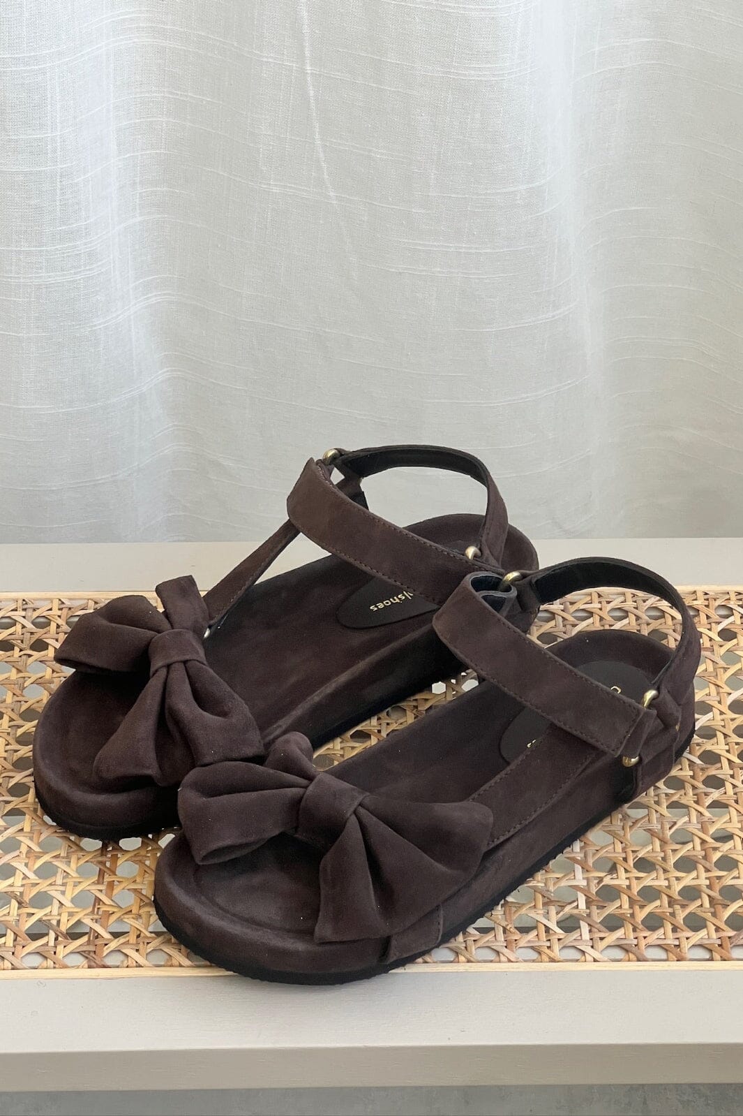 Sandaalit Copenhagen Shoesilta, valmistettu pehmeästä tummanruskeasta mokasta. Sandaaleissa on koristeellinen rusetti eturemmin päällä ja kaksi remmiä metallirenkailla.