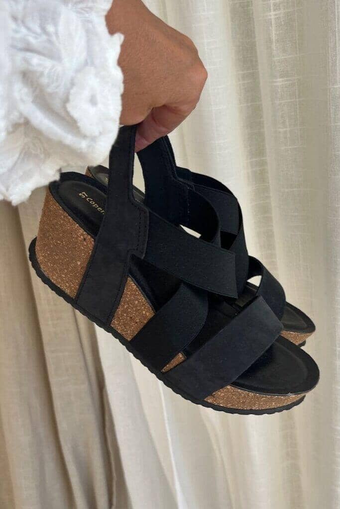 Musta sandaali Copenhagen Shoesilta, jossa on ristikkäiset remmit nubukista ja elastisesta materiaalista. Sandaalissa on korkkipohja ja erityisesti kehitetty vaahtopohja, joka tarjoaa hyvää tukea jalalle.