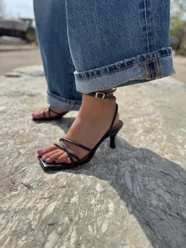 Musta korkokengät nahasta, joissa on ristikkäiset remmit jalan päällä ja nilkkaremmi soljella. Neliönmuotoinen kärki ja korkea korko antavat kengille puhtaan ja yksinkertaisen muotoilun.