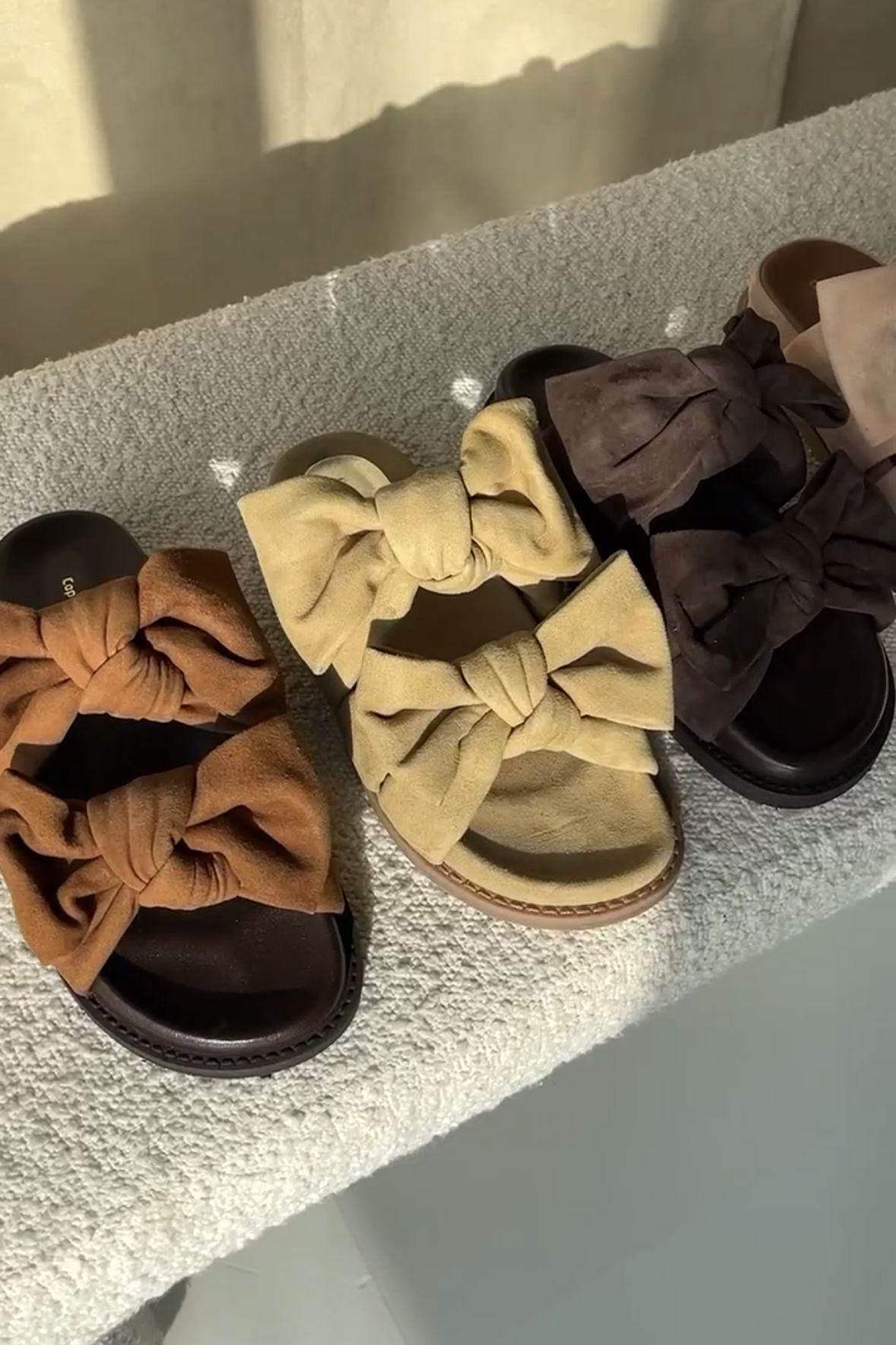 Copenhagen Shoes -sandaalit pehmeästä mokasta, jossa on konjakinvärinen pinta. Mallissa on kaksi suurta koristeellista rusettia remmeissä.