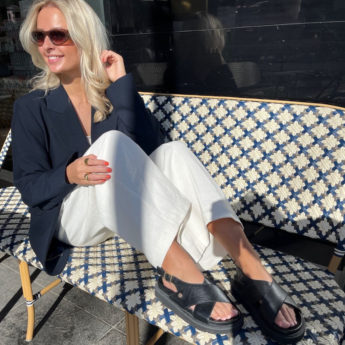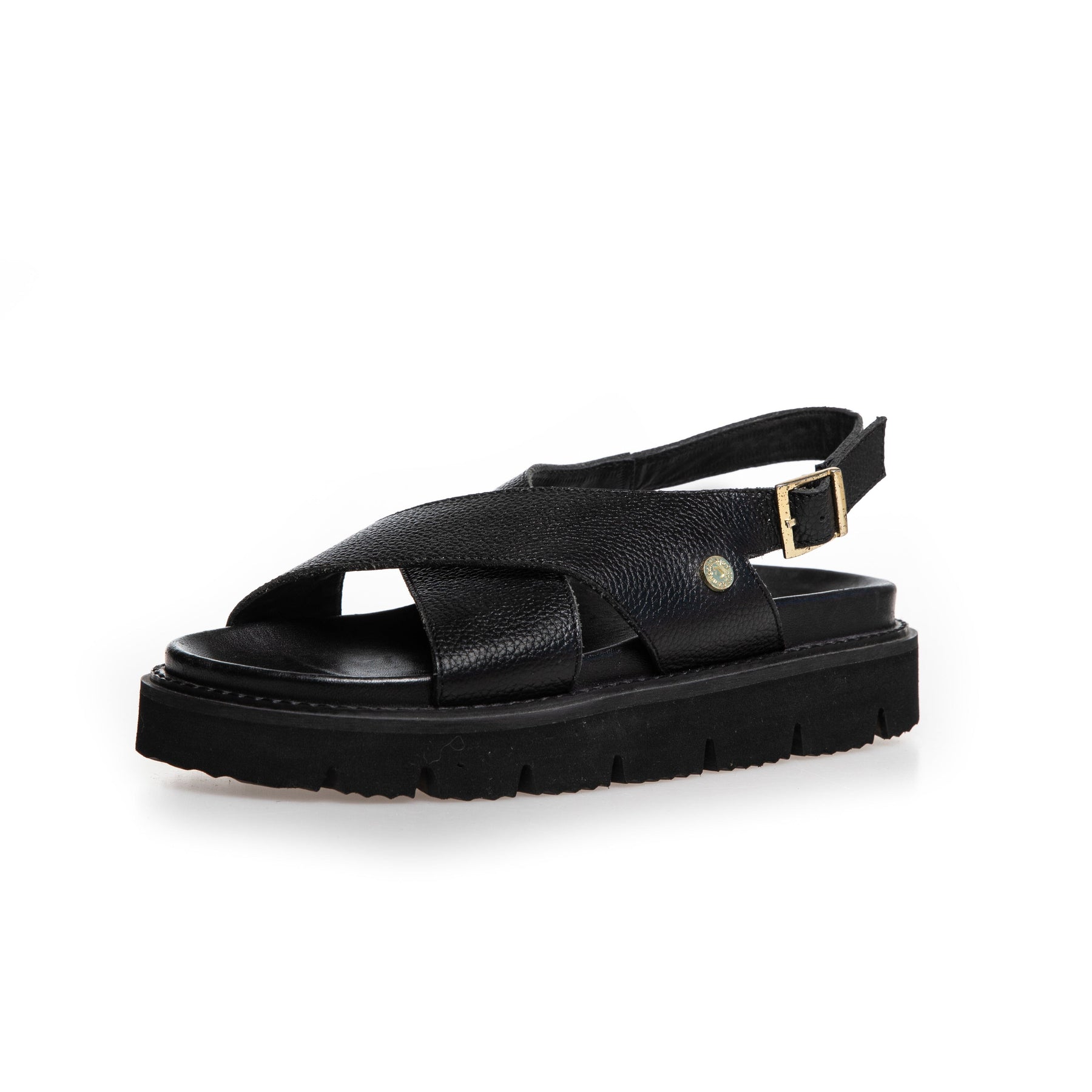 Musta nahkasandaalit Copenhagen Shoesilta, joissa on ristikkäinen muotoilu jalan päällä. Sandaleissa on kultainen solki kantaremissä ja EVA-pohjat, joissa on hyvä iskunvaimennus.