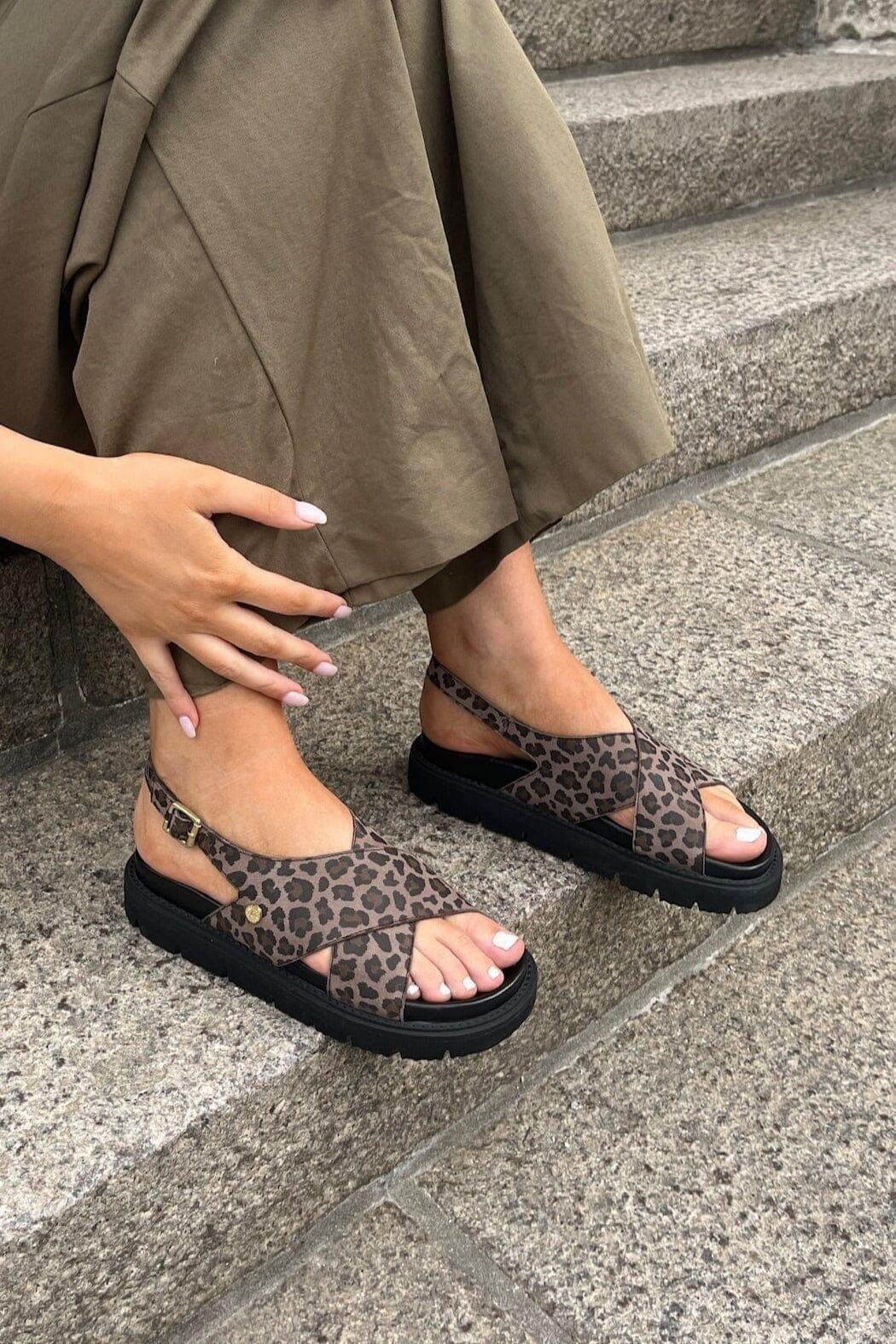 Copenhagen Shoesin sandaalit mokasta mustalla ja ruskealla leopardikuviolla. Sandaaleissa on ristikkäin menevät remmit jalan päällä ja käytännöllinen solkilukko nilkassa.