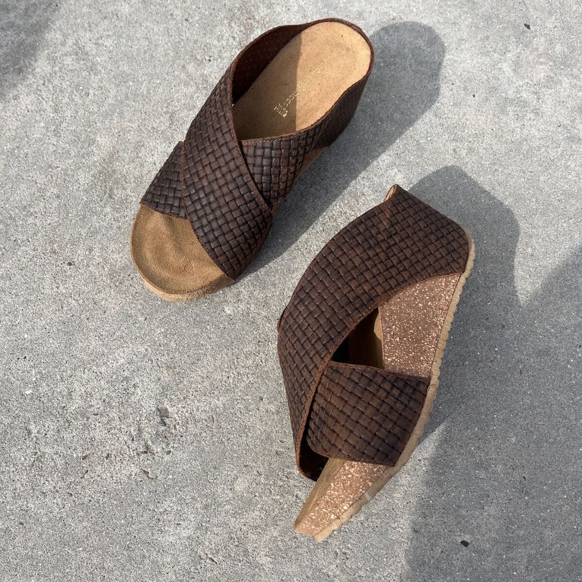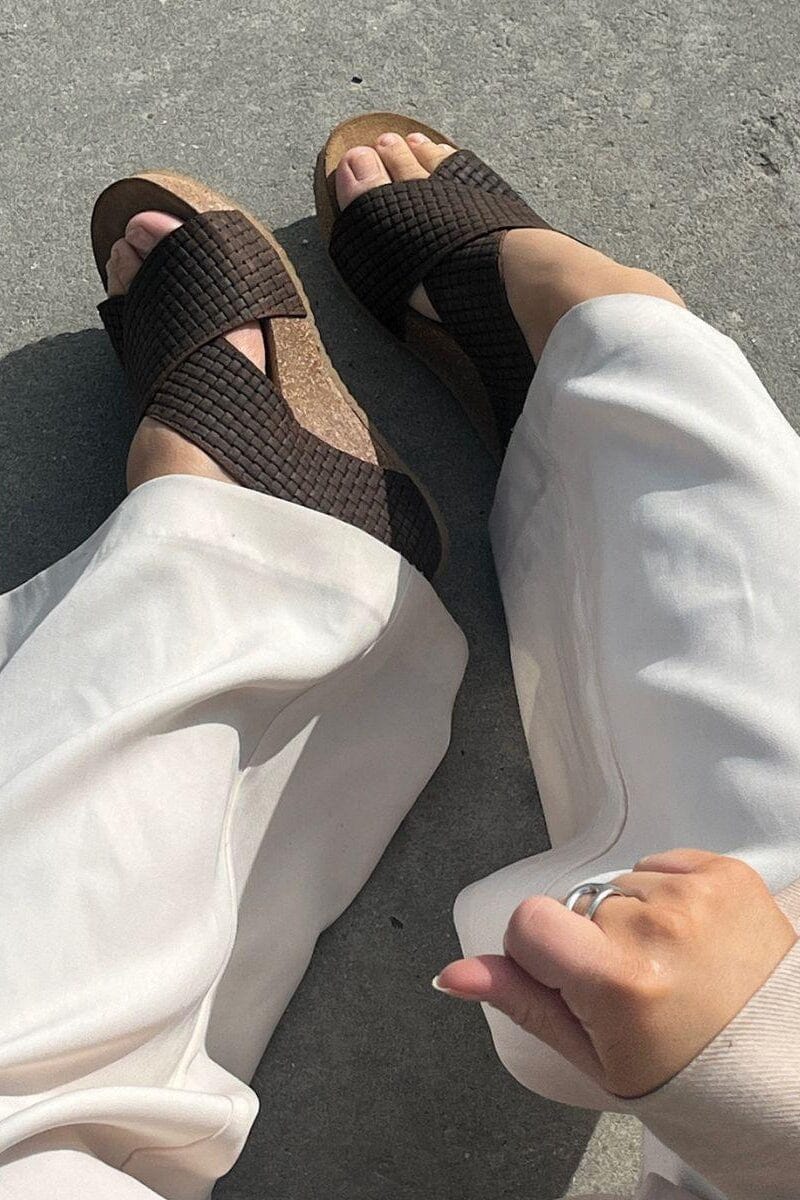 Sandaalit Copenhagen Shoesilta tummanruskeasta mokasta, ristiin menevillä remmeillä ja korkkimaisella kiilakorolla.