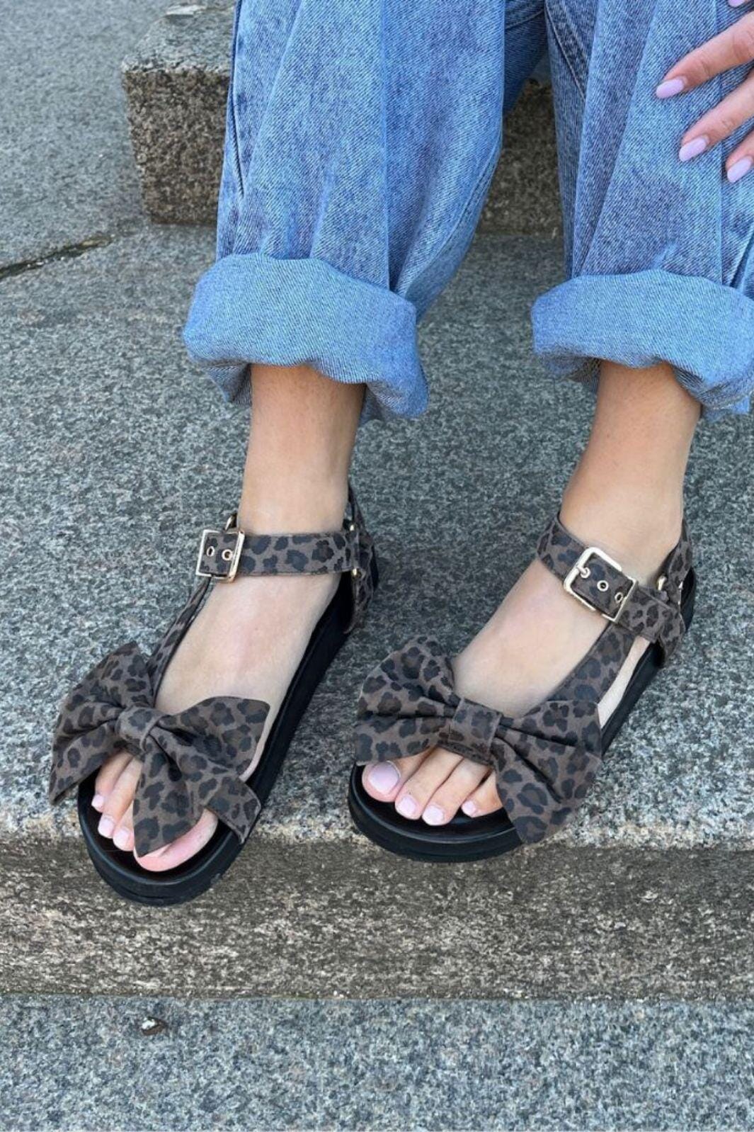 Sandaalit Copenhagen Shoesilta mokasta ja nahasta leopardikuosilla sävyssä Mouse. Suuri solki edessä ja solki-kiinnitys antavat sandaalille naisellisen ilmeen.