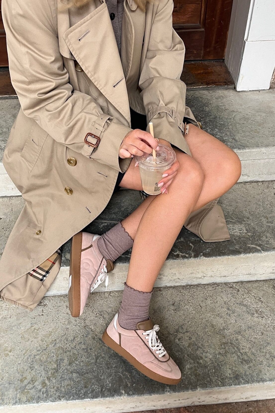 Vaaleanpunaiset tennarit Copenhagen Shoesilta, pehmeää mokkanahkaa, valkoiset nauhat ja ruskea pohja. Koristeelliset tikkaukset sivuilla.