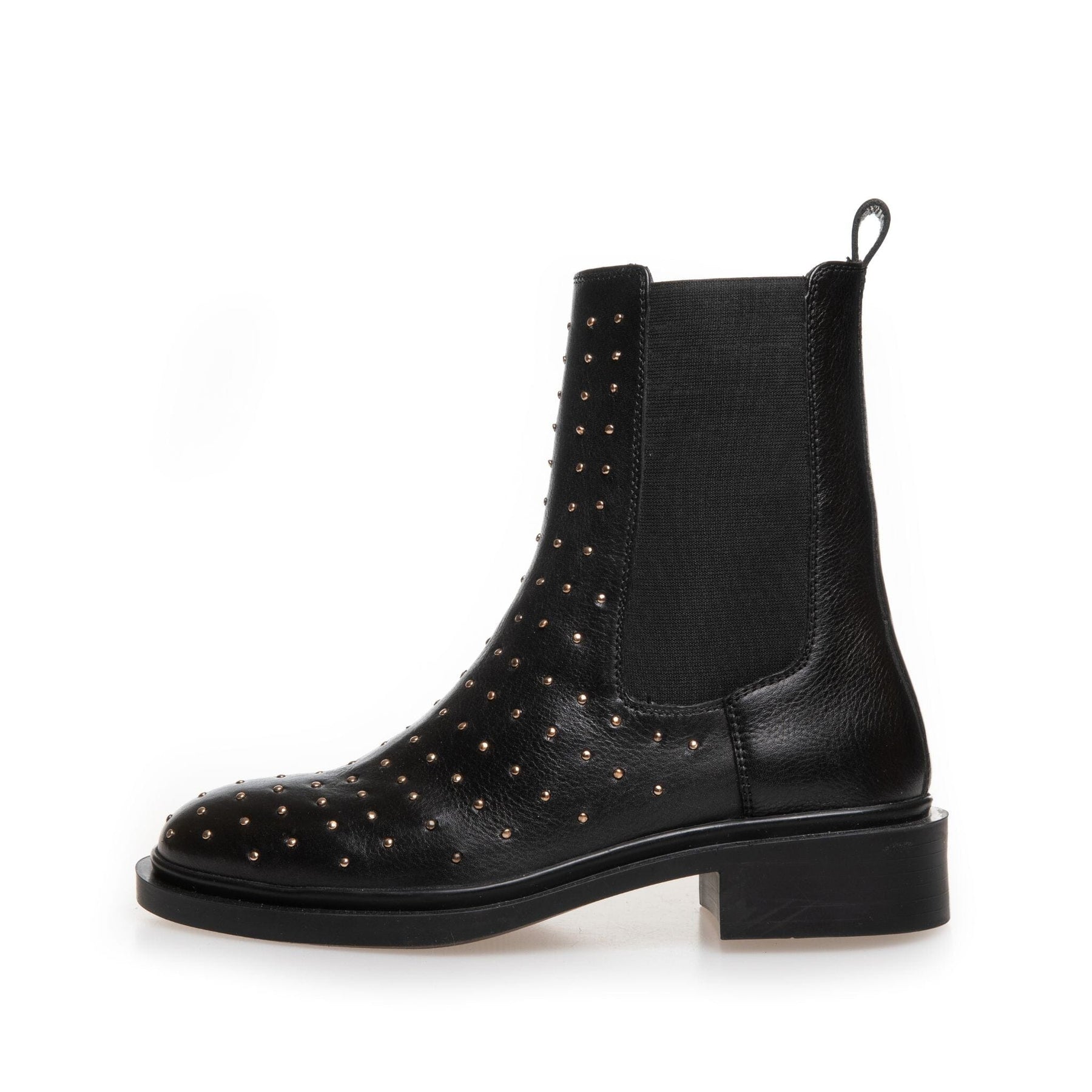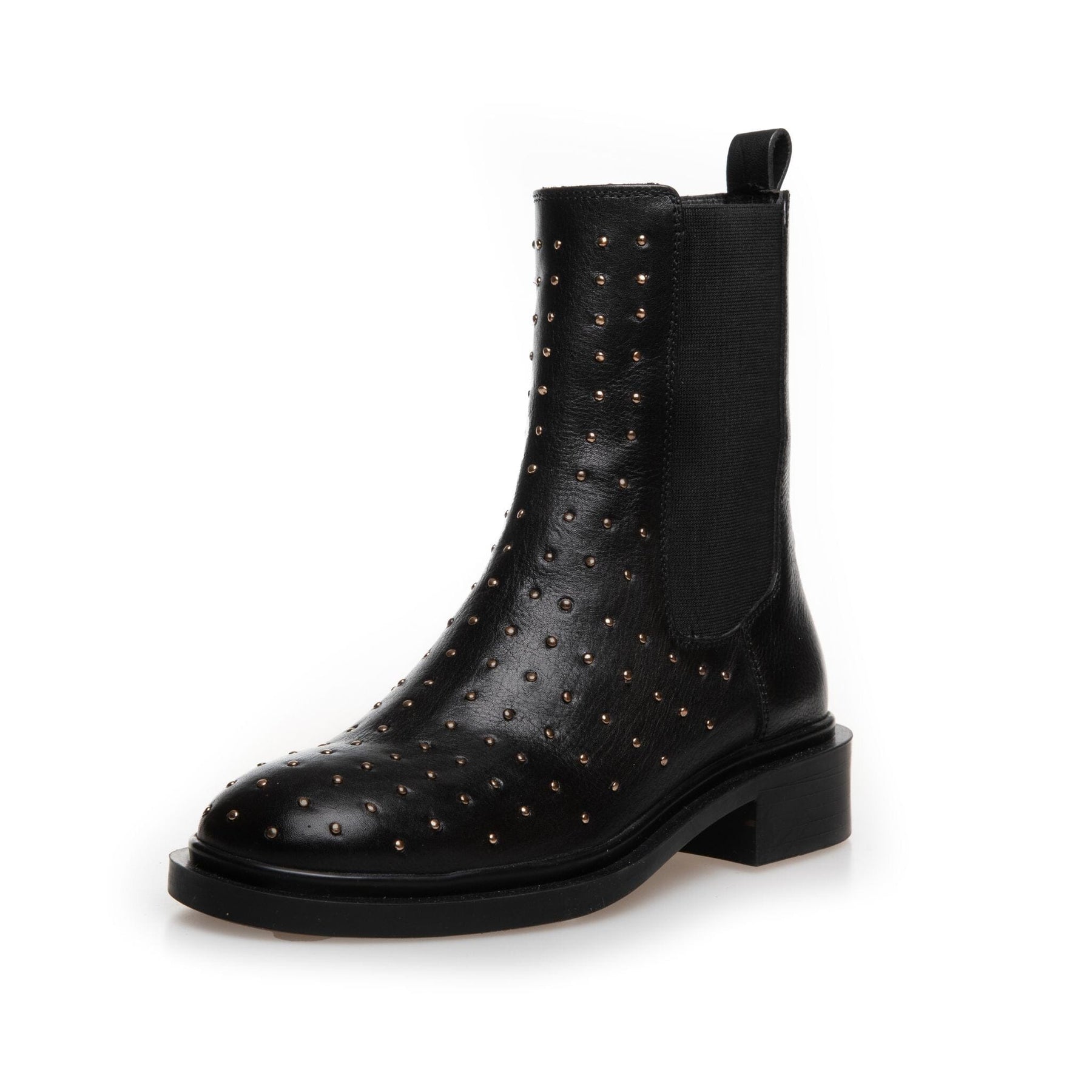 "Mustat nilkkurit Copenhagen Shoesilta nahasta, joissa on niittejä ja helmikoristeita. Kengissä on mantelin muotoinen kärki ja matala lohkokorko.
