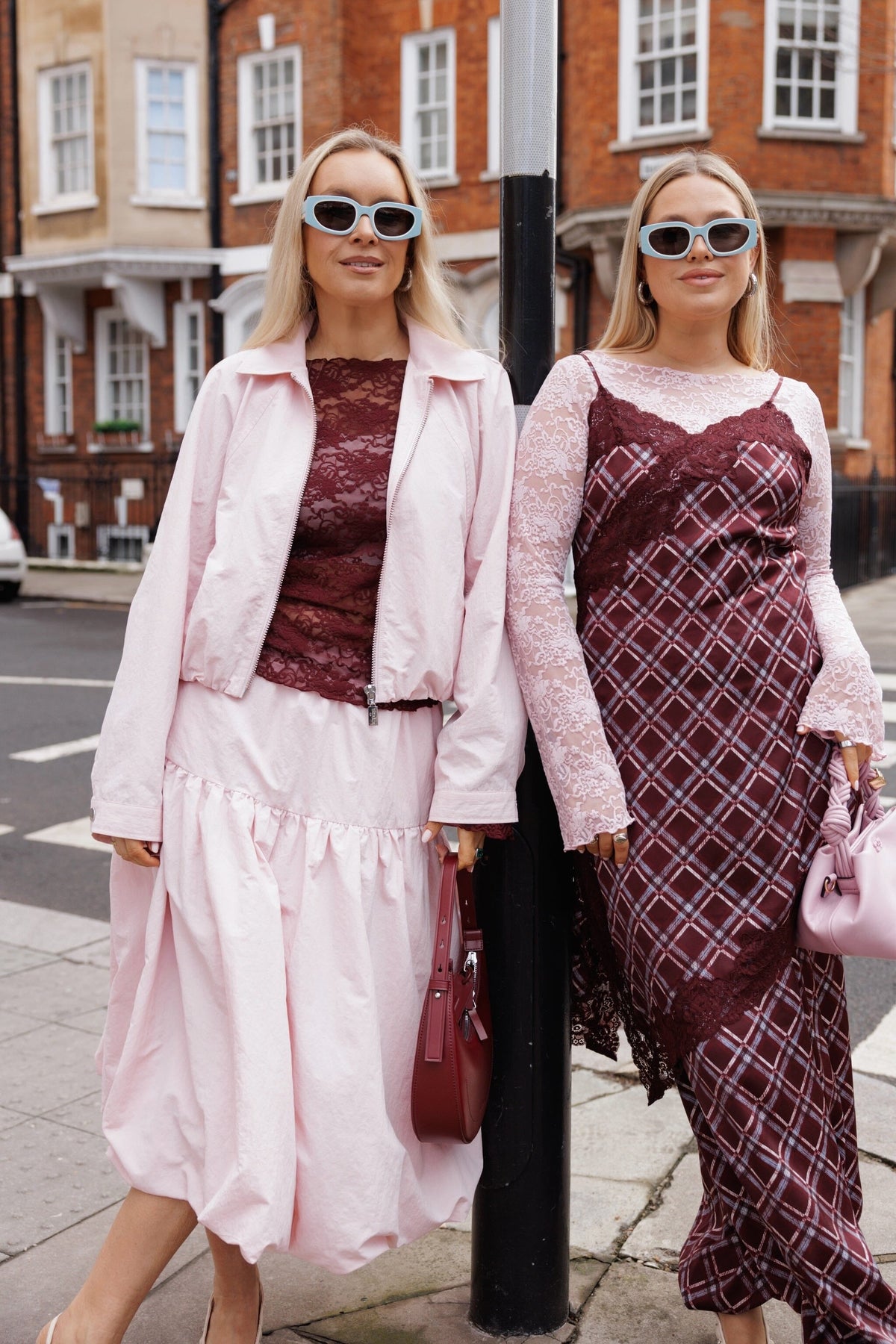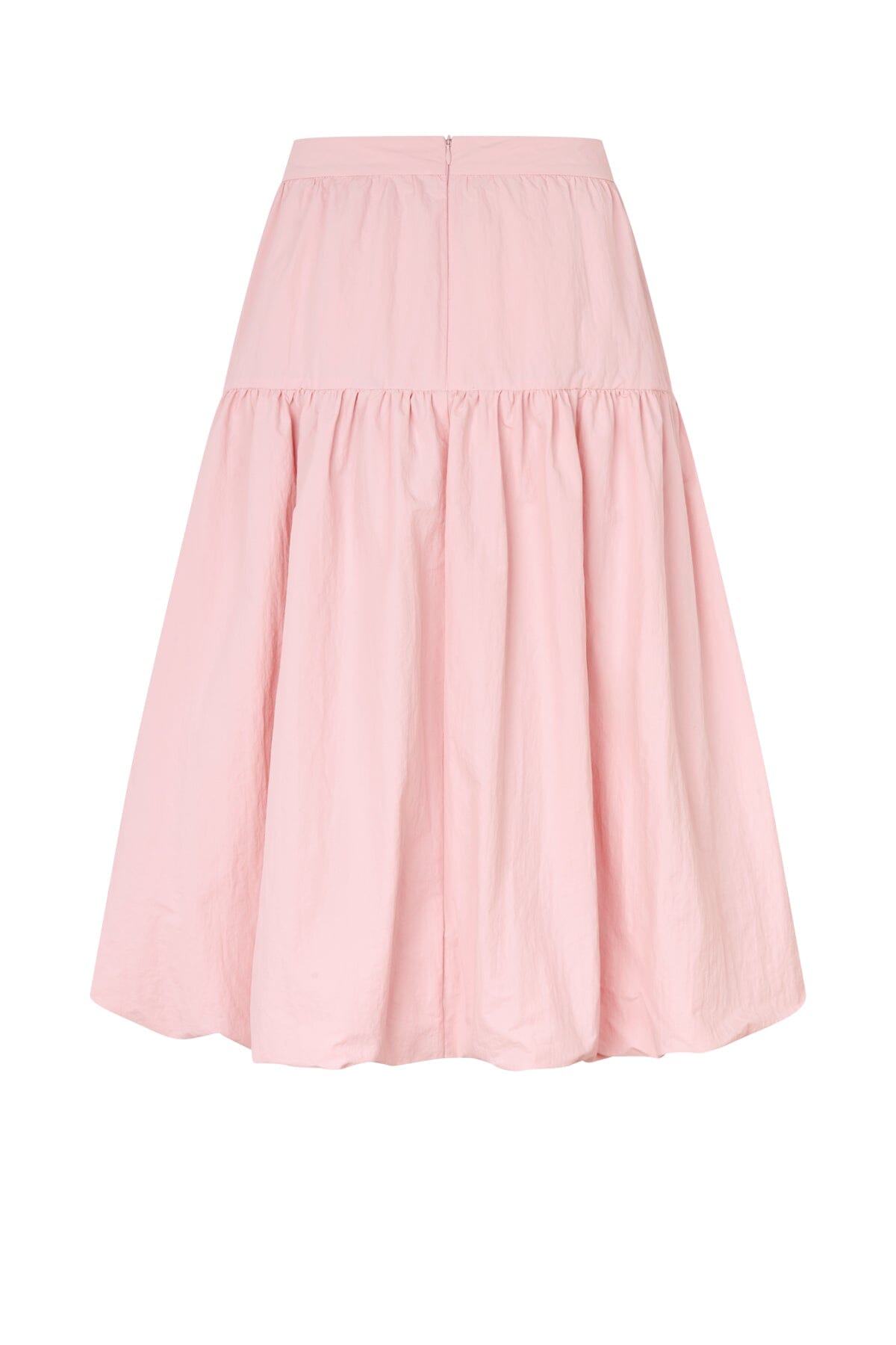 Vaaleanpunainen Cras-hame, valmistettu 100 % nylonista. Hameessa on korkea vyötärö ja väljä istuvuus, jossa on kerroksittaisia rypytyksiä saumoissa.