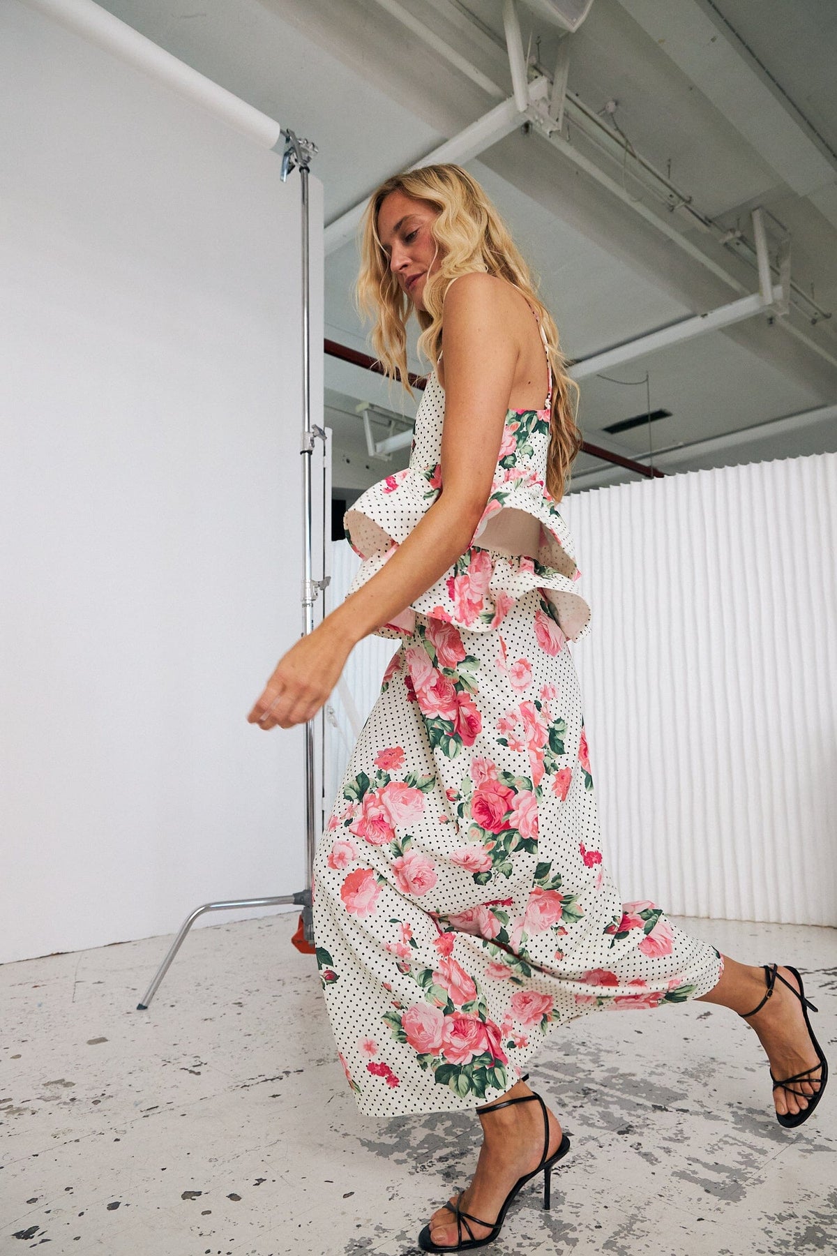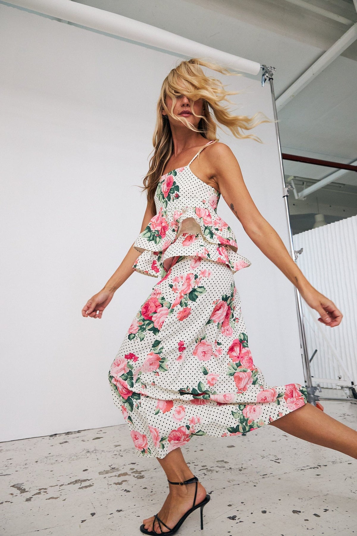 Crasin toppi, jossa on vaaleanpunaisia ruusuja ja mustia pisteitä valkoisella pohjalla. Topissa on volyymikkaita frilloja ja säädettävät spagettiolkaimet.