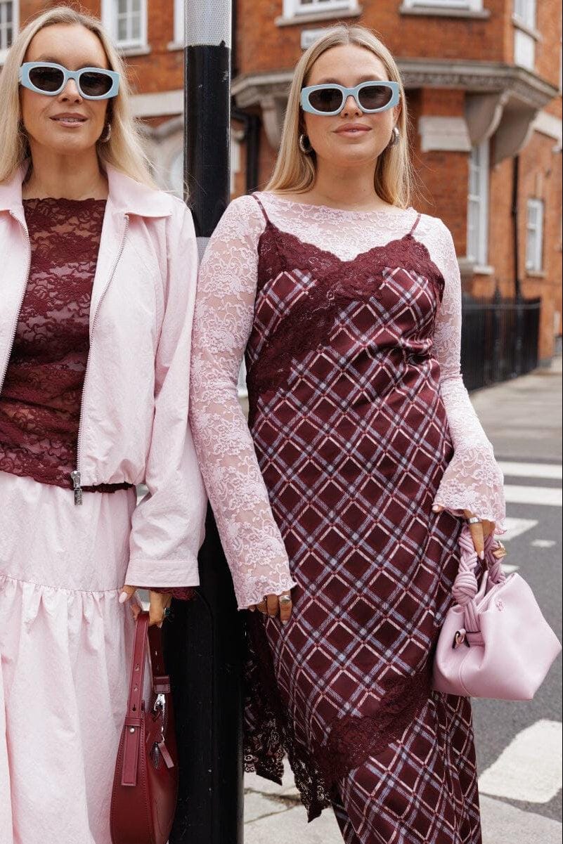 Cras-mekko, jossa on burgundinpunainen ruutukuvio. Siinä on ohuet spagettiolkaimet ja epäsymmetrinen pitsireunus.