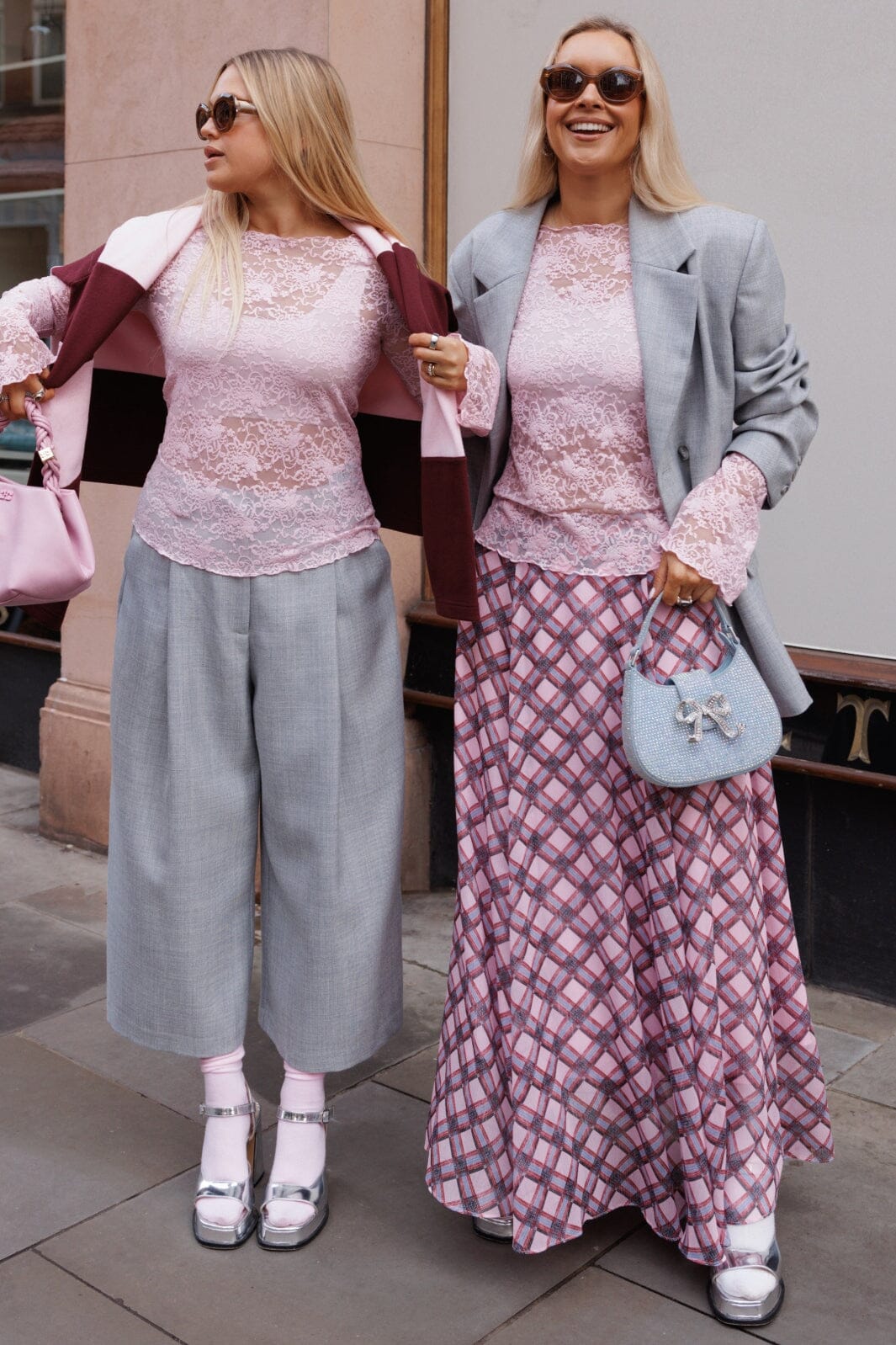 Pitkä hame Crasilta, jossa on vaaleanpunainen ruutukuvio. Hame on valmistettu 100 % kierrätetystä polyesteristä ja siinä on leveä, laskeutuva siluetti.