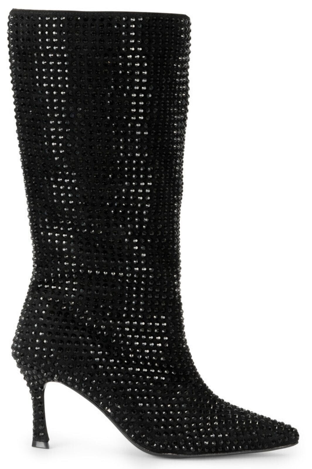 Musta saappaat Crasilta, joissa on paljetteja koko pinnalla. Saappaissa on terävä kärki ja stiletto-korko. Korkeat varret ja kiiltävät yksityiskohdat tekevät niistä sopivia juhliin ja muodollisiin tilaisuuksiin.