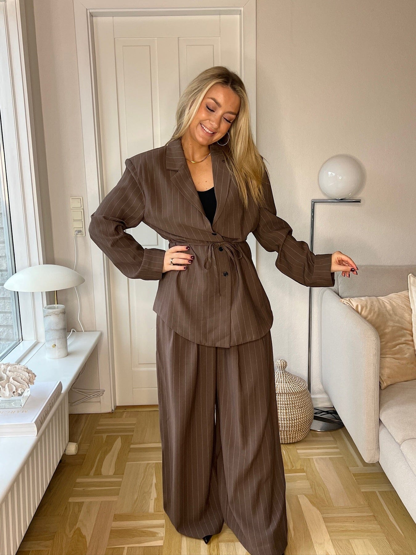 Ruskeat Dear Molly -housut, joissa on raidallinen kuvio. Housut on valmistettu kudotusta materiaalista, ja niissä on lattiaan ulottuva pituus, korkea vyötärö ja solmittava nauha.