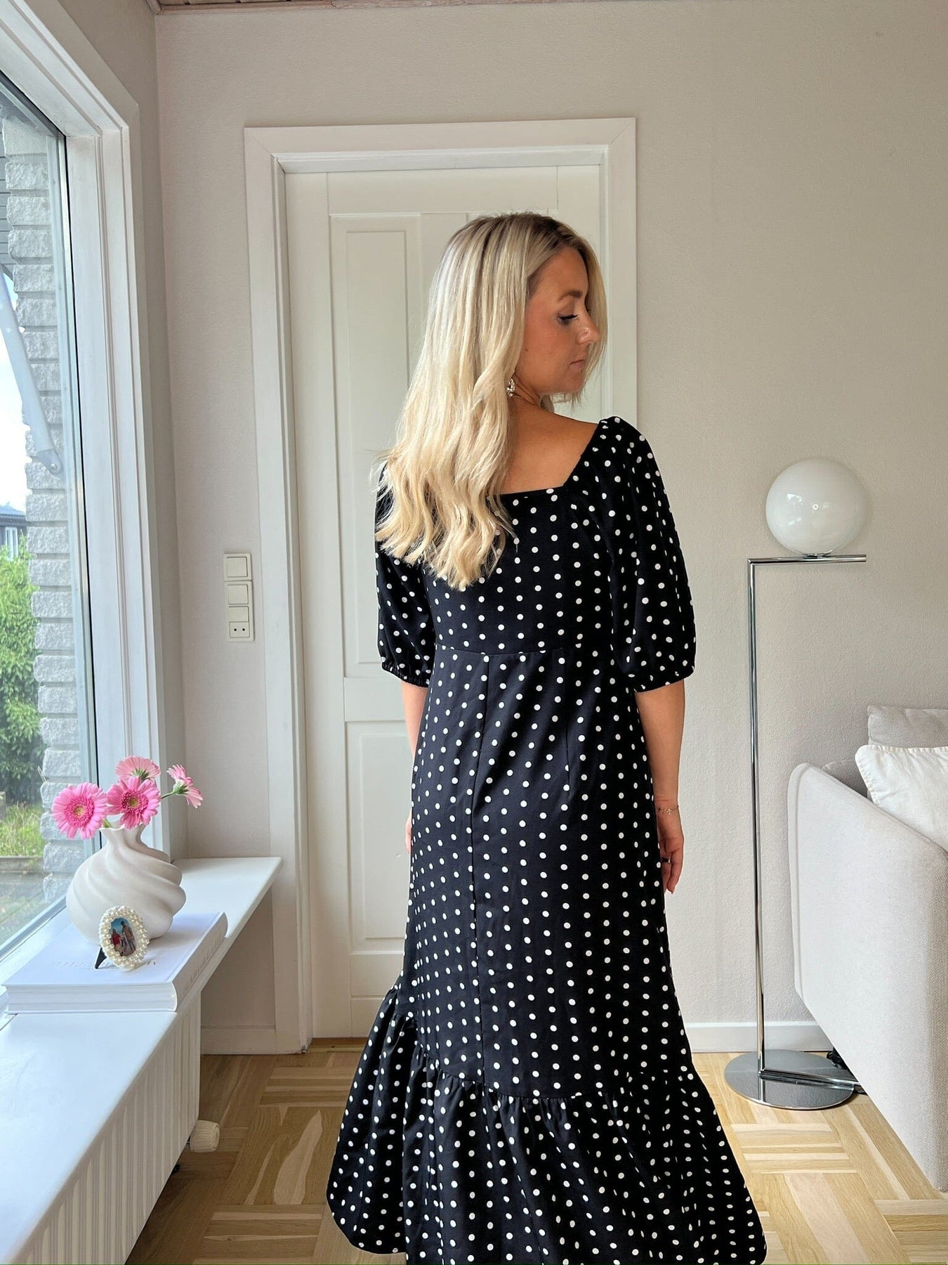 Musta nilkkapituinen mekko valkoisilla pisteillä. Neliömäinen pääntie ja 3/4-hihat antavat mekolle puhtaan ja yksinkertaisen ilmeen. Helman röyhelö luo liikettä löysässä istuvuudessa.