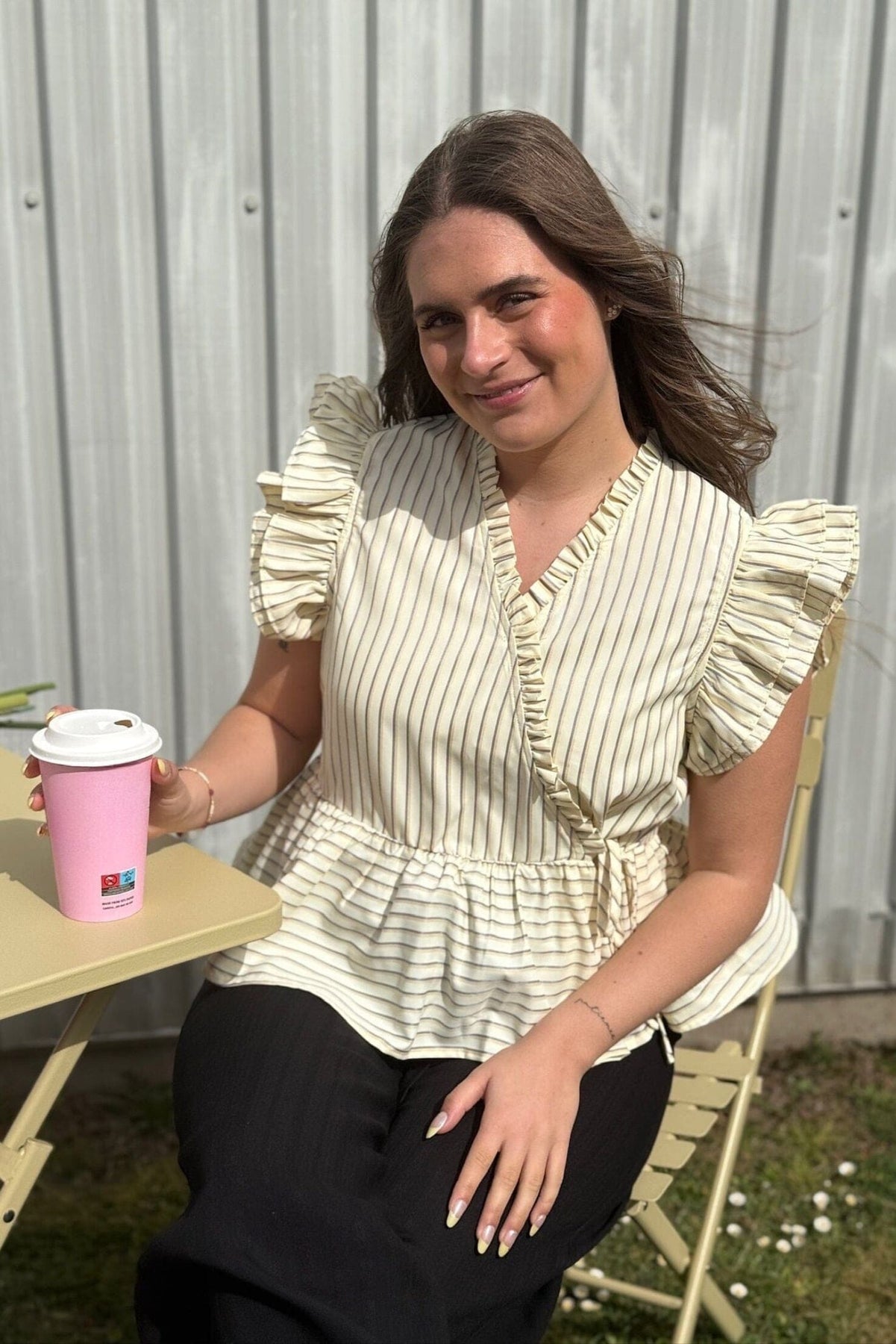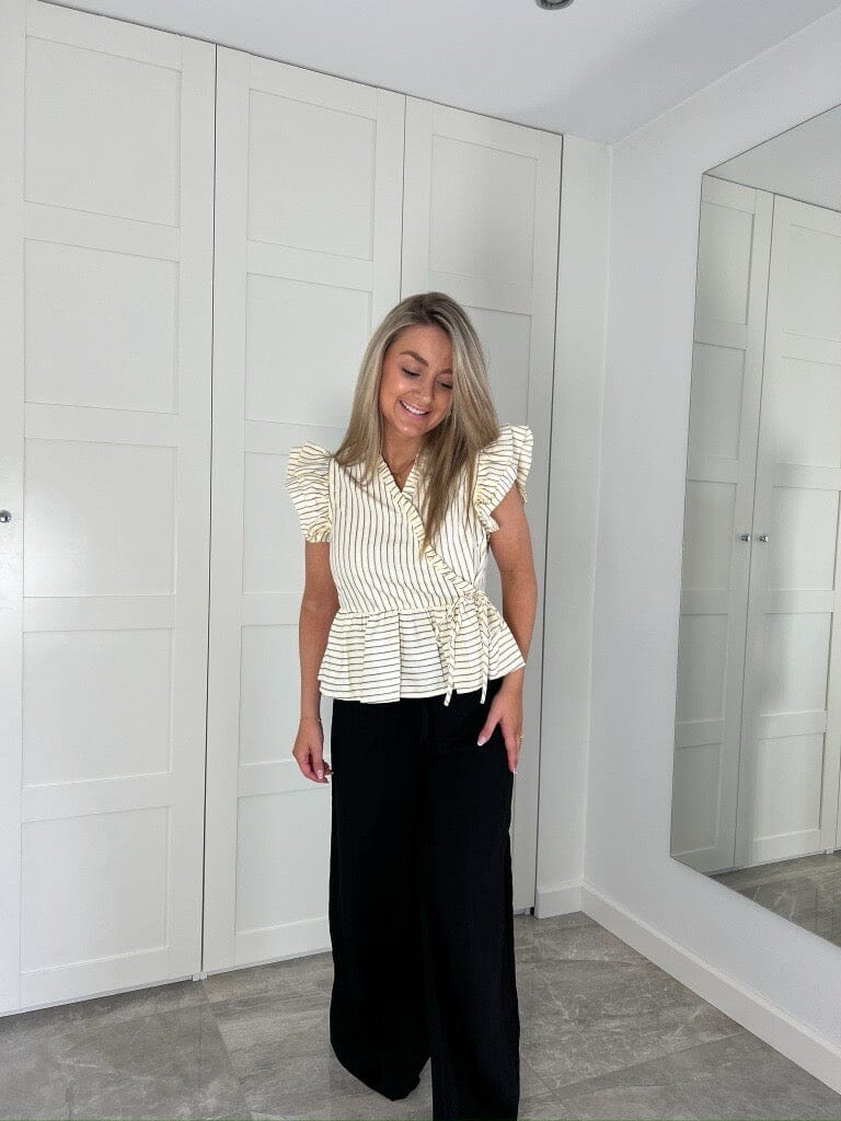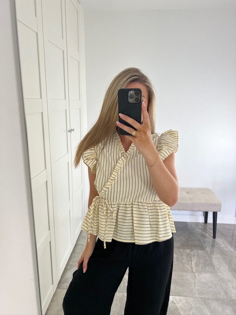 Raidallinen paita Dear Mollylta, jossa on keltaisia ja violetteja raitoja. Paidassa on röyhelöyksityiskohtia hihoissa ja peplum-efekti vyötäröllä. V-pääntie nauhakiinnityksellä mahdollistaa istuvuuden säätämisen.