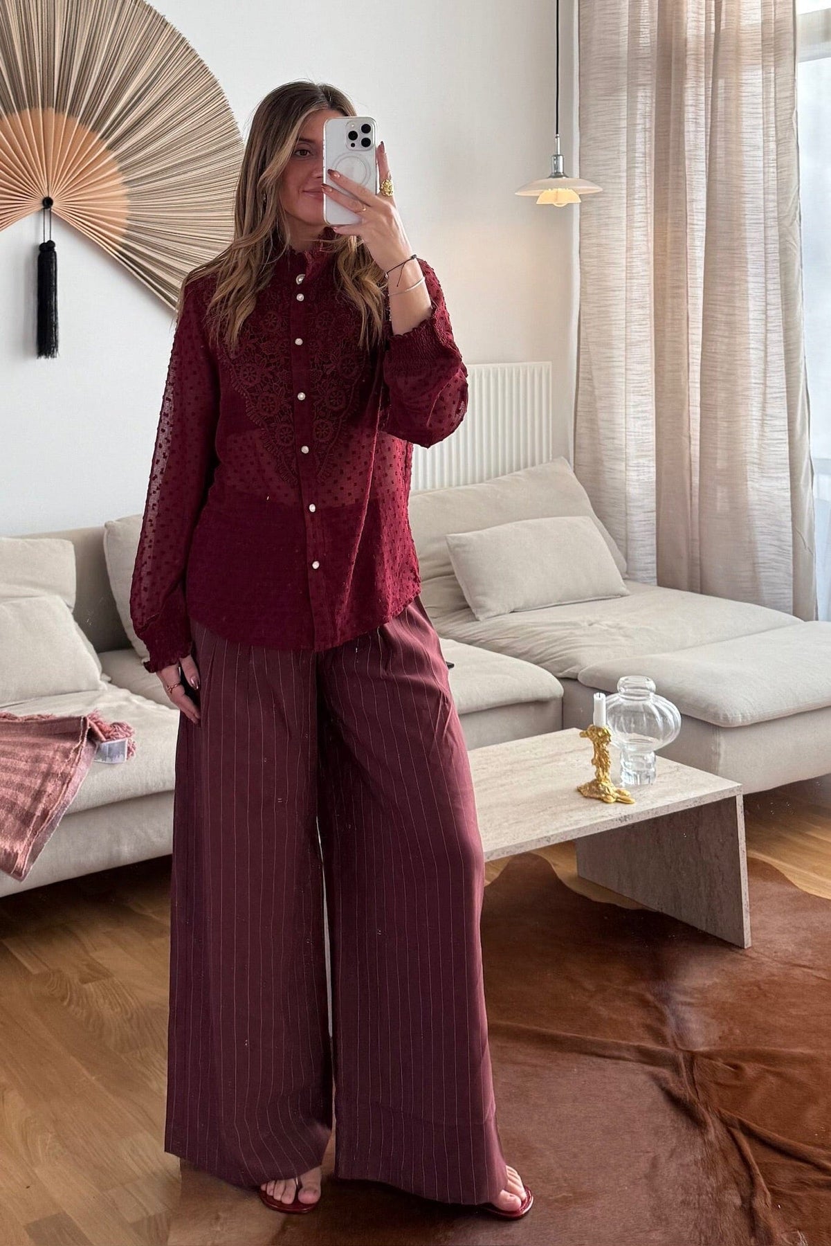 Viininpunainen paita Dear Mollylta, jossa on kukka- ja pilkkukuosi. Paidassa on kirjailuja, helmiyksityiskohtia ja röyhelöitä, ja se suljetaan napeilla.