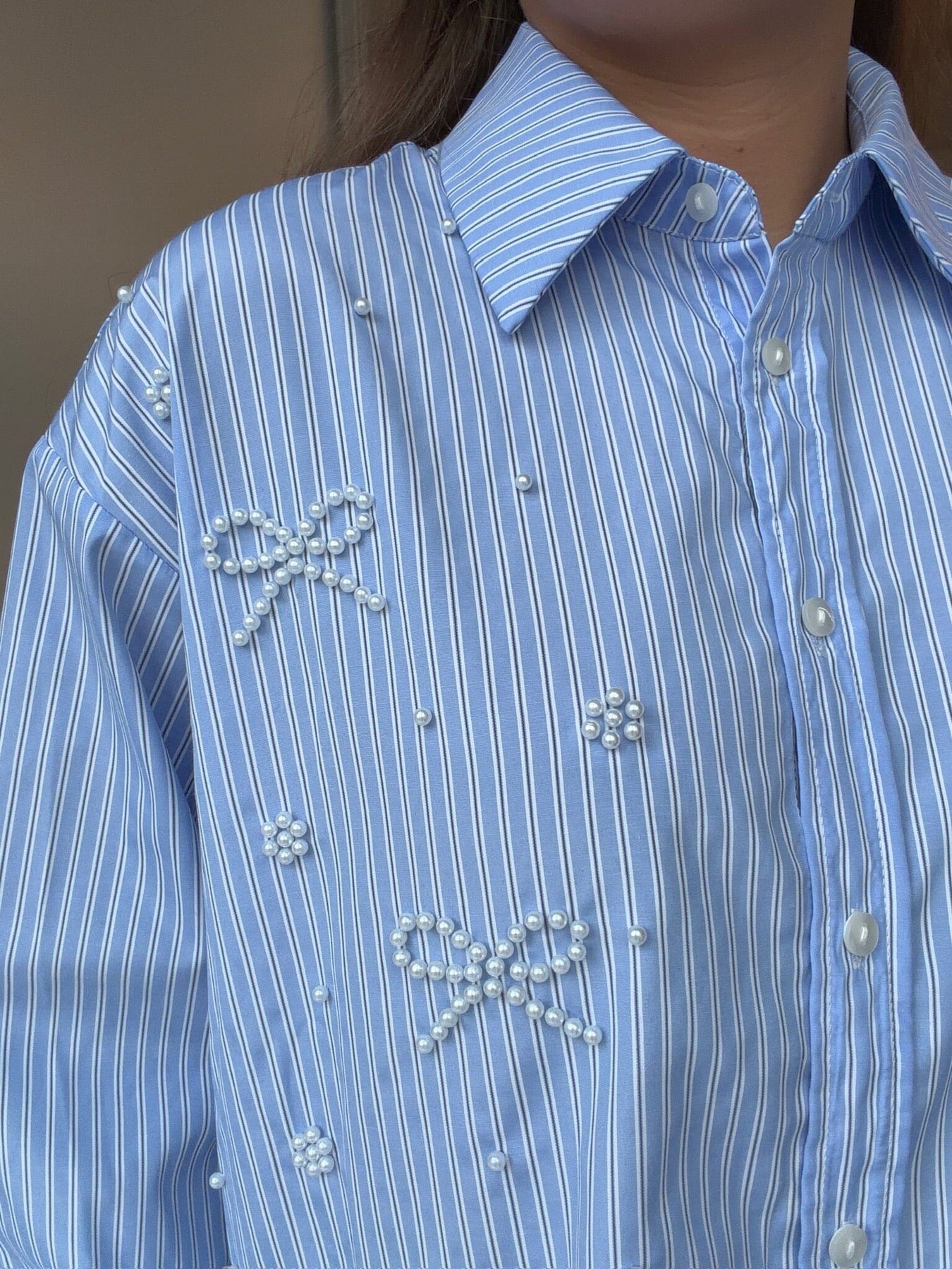 Dear Molly -paita vaaleansinisessä värissä, valkoisilla raidoilla. Helmirusetit on sijoitettu kauttaaltaan paidan pinnalle ja ne antavat sille koristeellisen ilmeen. Paita sopii sekä muodollisiin että rennompaan käyttöön.