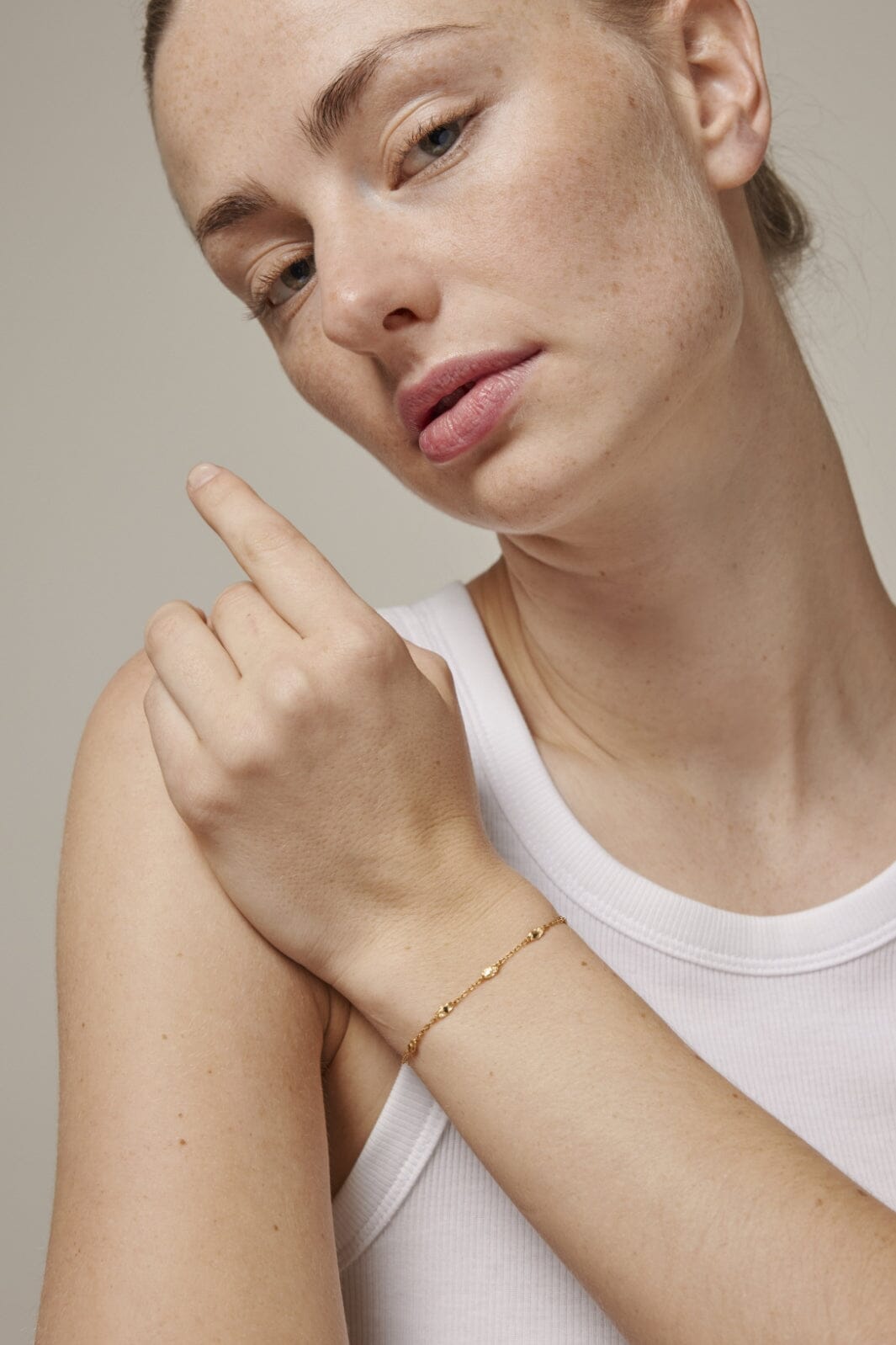 Käsintehty rannekoru Enamel Copenhagenilta, jossa on ketjusuunnittelu ja teksturoituja elementtejä. Rannekorussa on pieniä, pyöreitä yksityiskohtia ketjun varrella, ja se on päällystetty 18 karaatin kullalla.