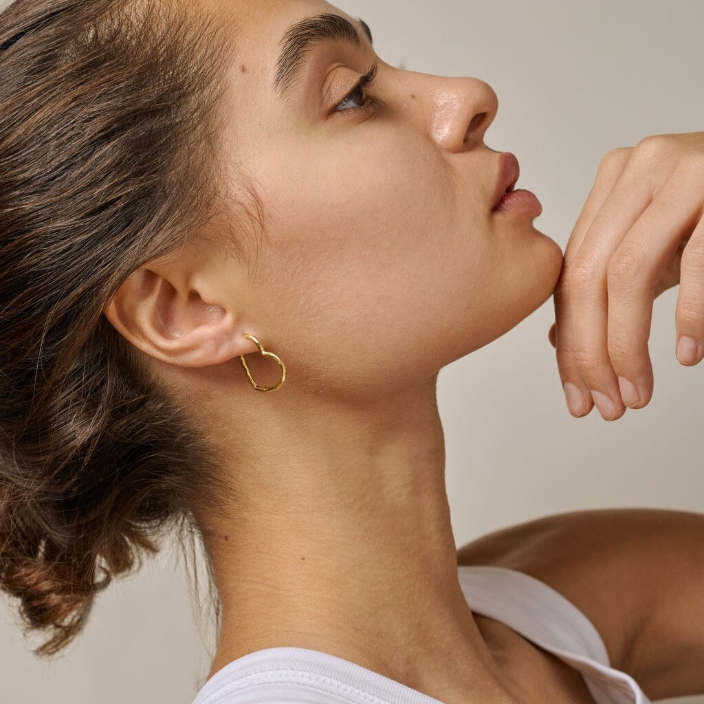 Sydänmuotoiset korvakorut Enamel Copenhagenilta. Käsintehdyt hoops kultapintaisesta kierrätetystä sterlinghopeasta, jossa on teksturoitu pinta ja orgaaninen muoto.