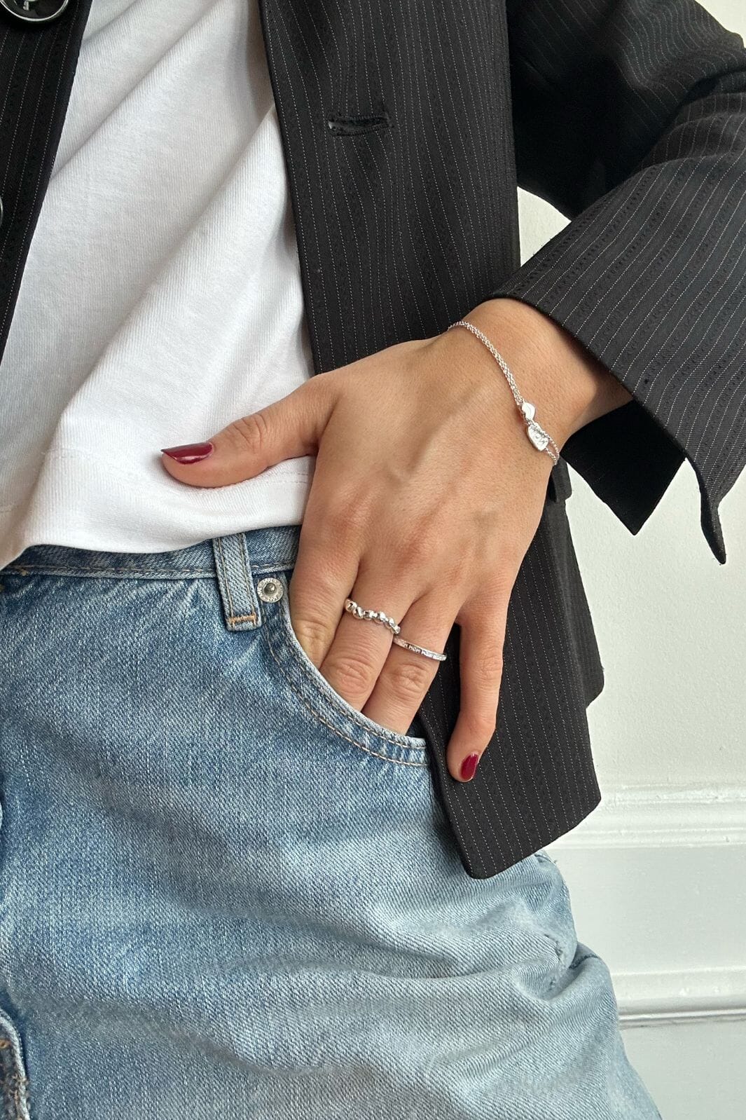 Enamel Copenhagen -sormus, valmistettu kierrätetystä sterlinghopeasta. Sormuksessa on muotoilu, jossa on pallomaisia segmenttejä hopeansävyisessä vivahteessa.