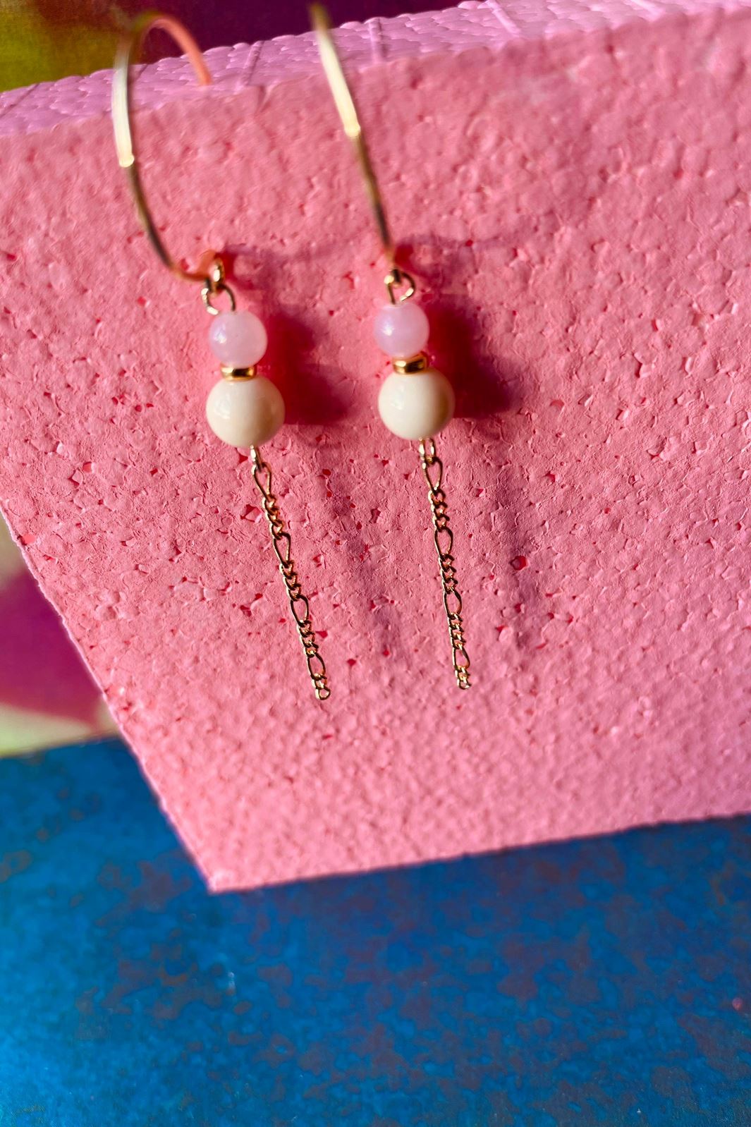 Creolikorvakorut, joissa on puolijalokiviä ja kultapintainen messinkiketju. Tanskalaiset korvakorut ovat 5,5 cm pitkiä ja yhdistävät vaaleanpunaisia helmiä kultaketjuun.