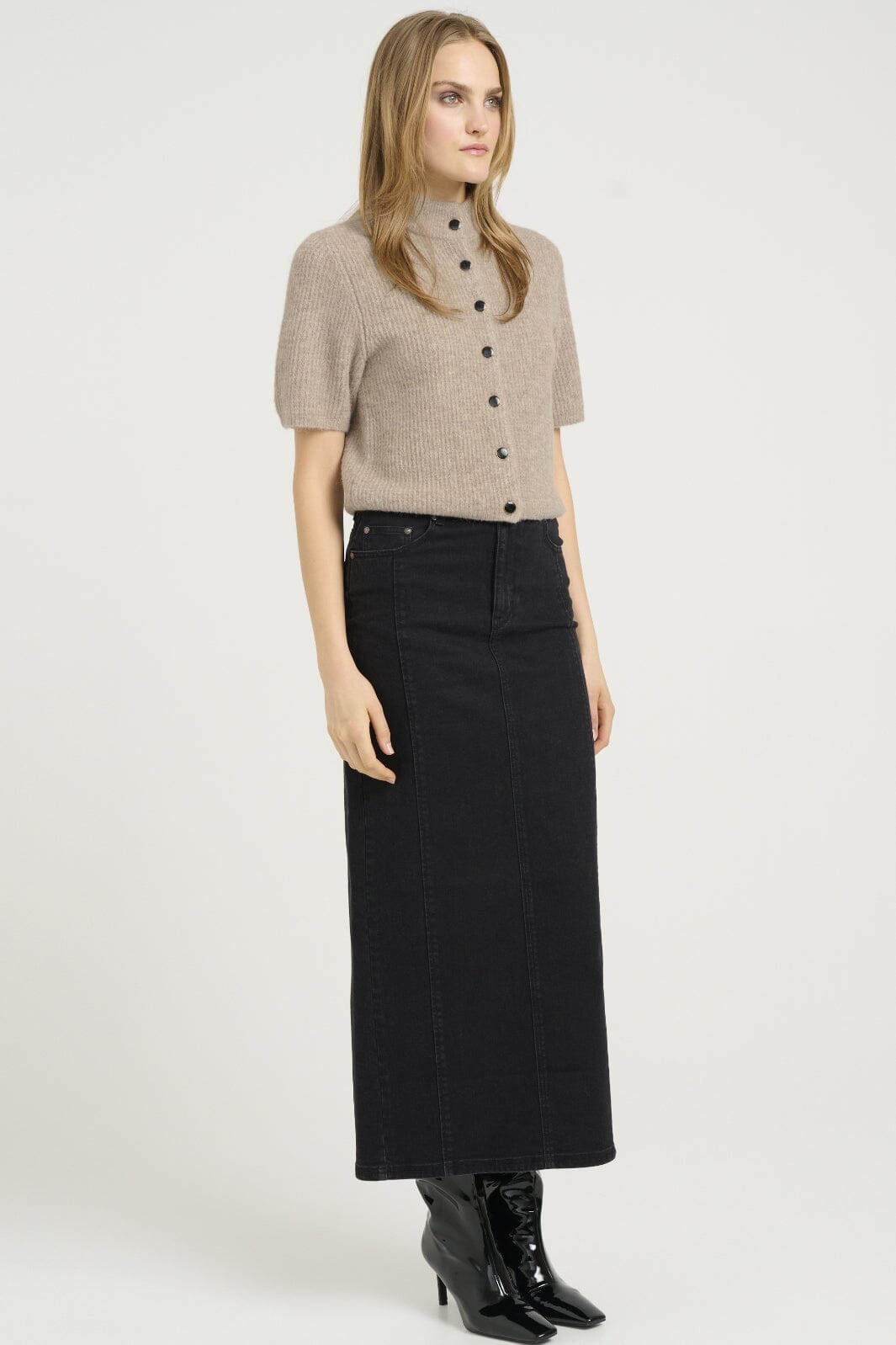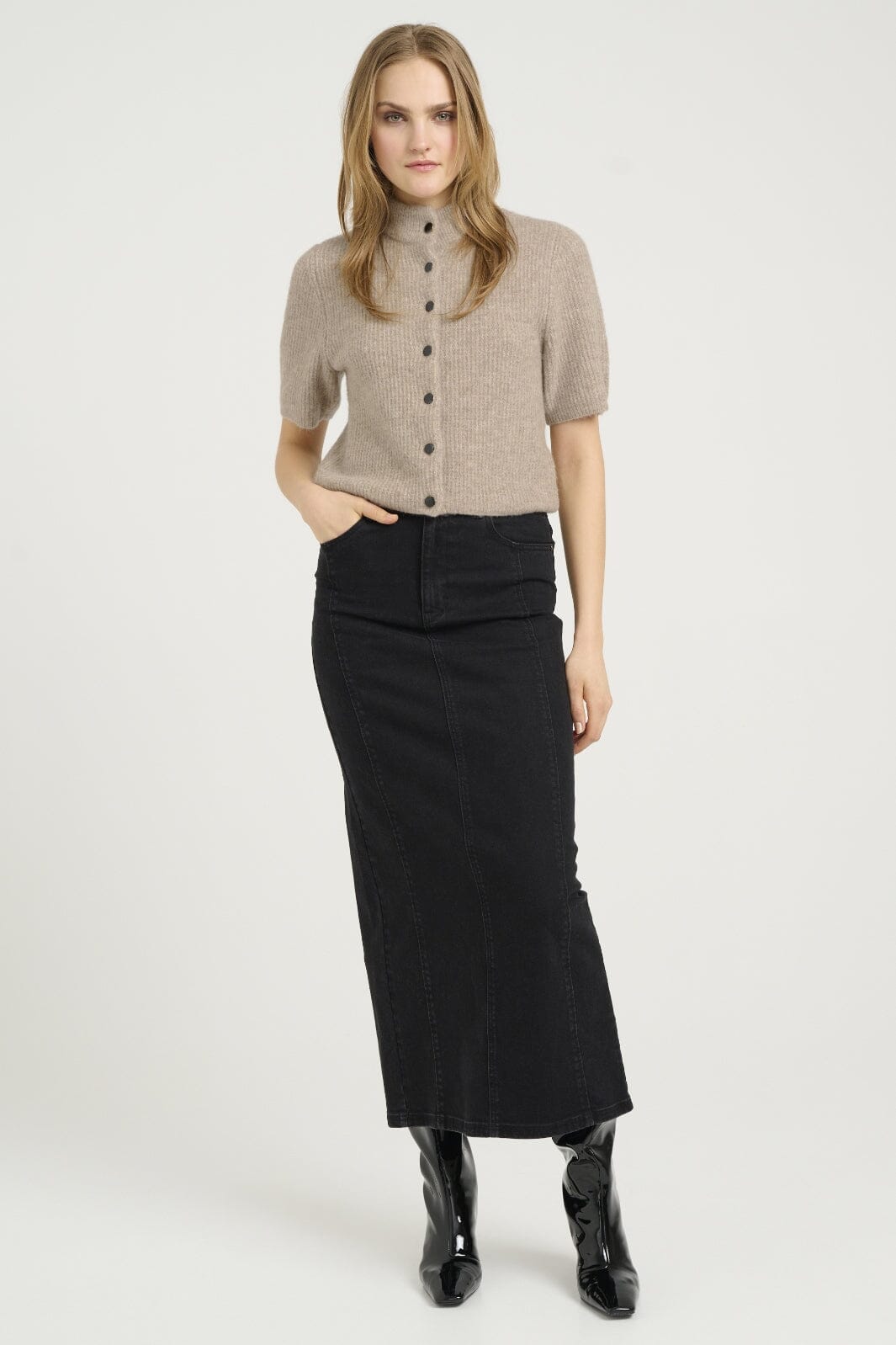 Lyhyt cardigan Gestuzilta lämpimässä hiekanvärisessä sekoitteessa. Siinä on korkea kaulus ja lyhyet hihat, joissa on rivi mustia nappeja edessä. Neuleella on pehmeä rakenne ja regular fit.
