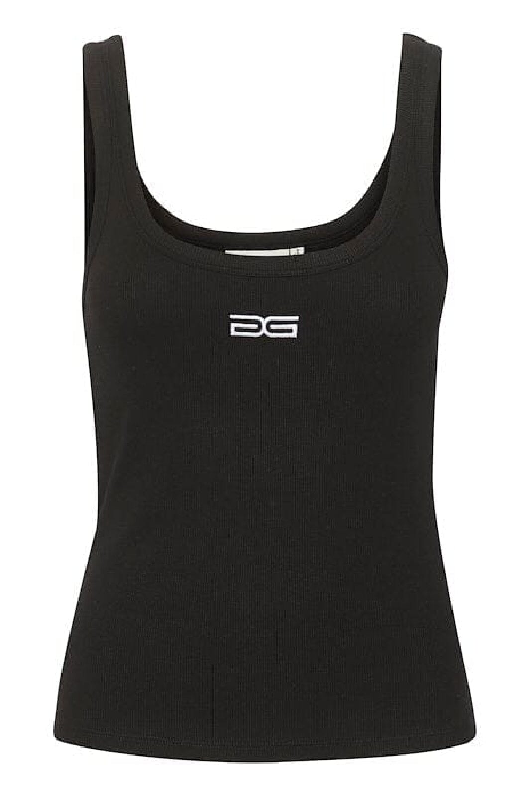 Musta tanktop Gestuzilta, jossa on ribattu pinta ja pyöreä kaula-aukko. Tiukka toppi, jossa on pieni valkoinen logo rinnassa ja leveät hihnat.