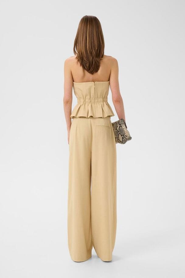 Olkaimeton toppi Gestuzilta vaalean beigeissä meleeratussa sävyssä. Topissa on peplum-efekti helmassa ja pystysuuntaiset saumat.