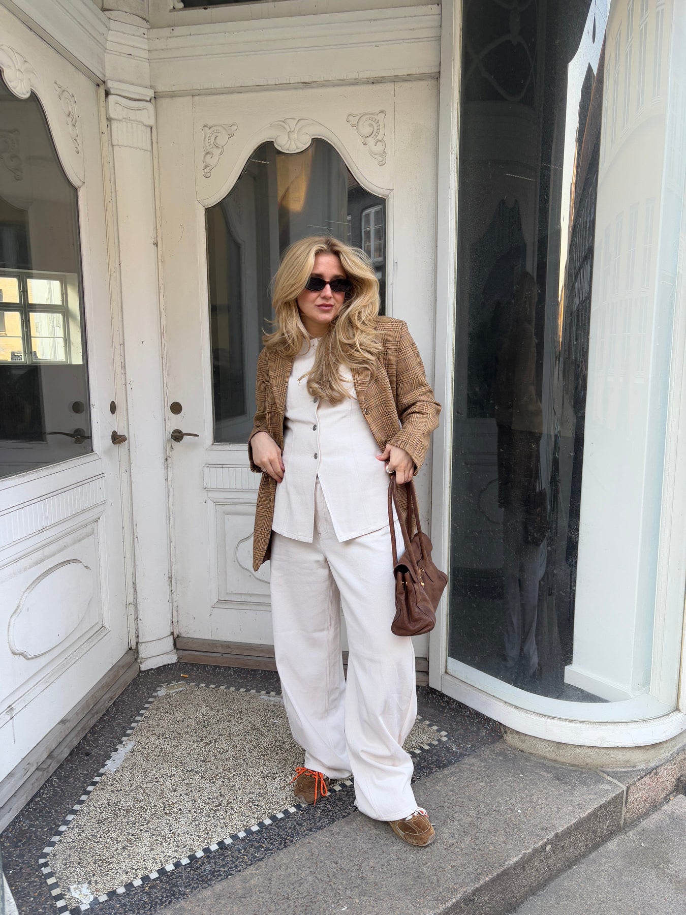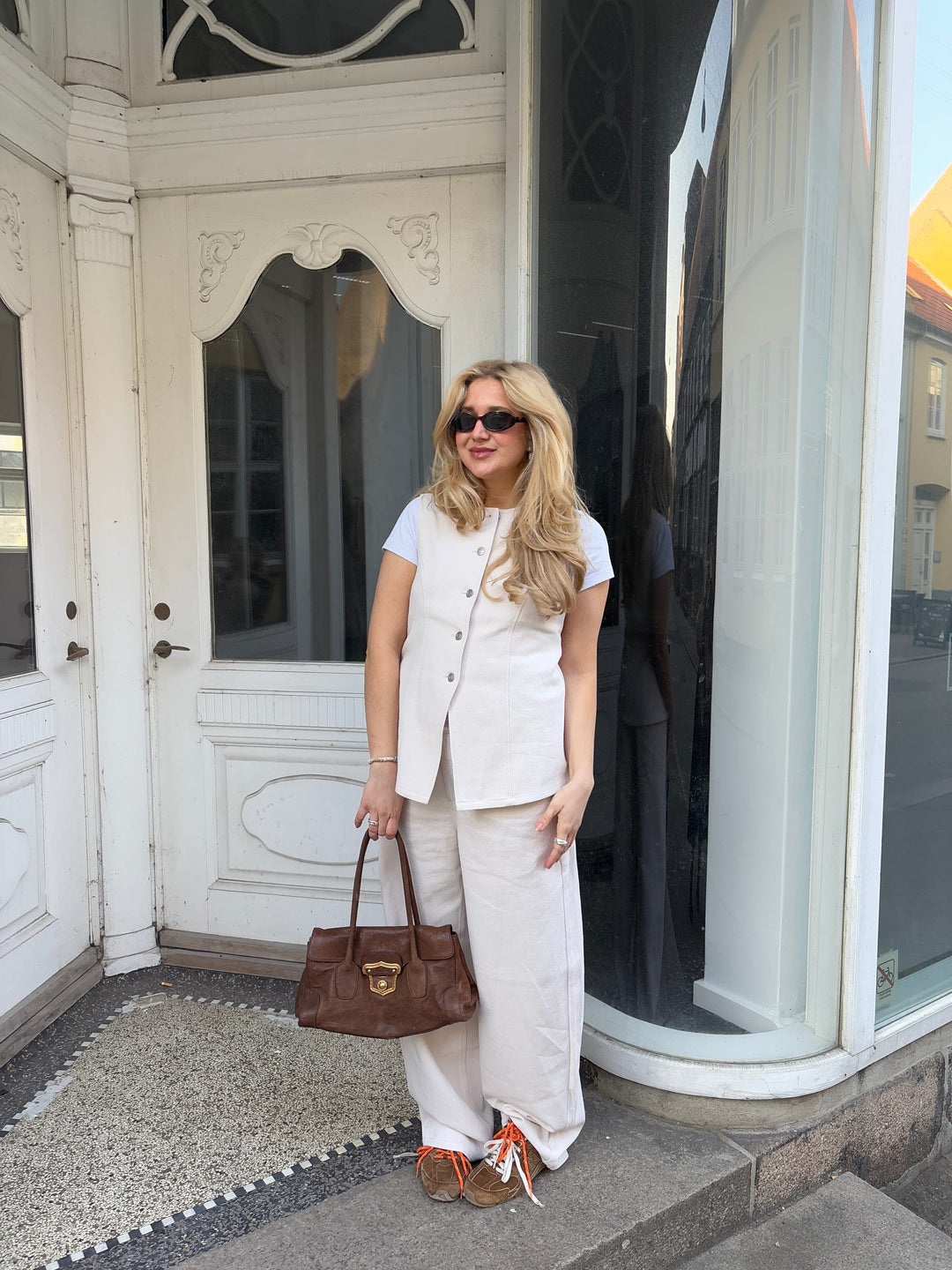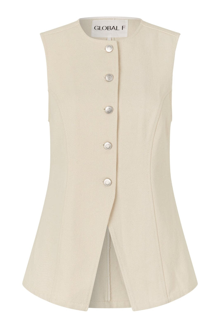 Olkaimeton liivi Global Funkilta vaaleassa ecru-värissä. Liivissä on pyöreä kaula-aukko, napit edessä ja koristeelliset saumat, jotka antavat siistin ja yksinkertaisen ilmeen.