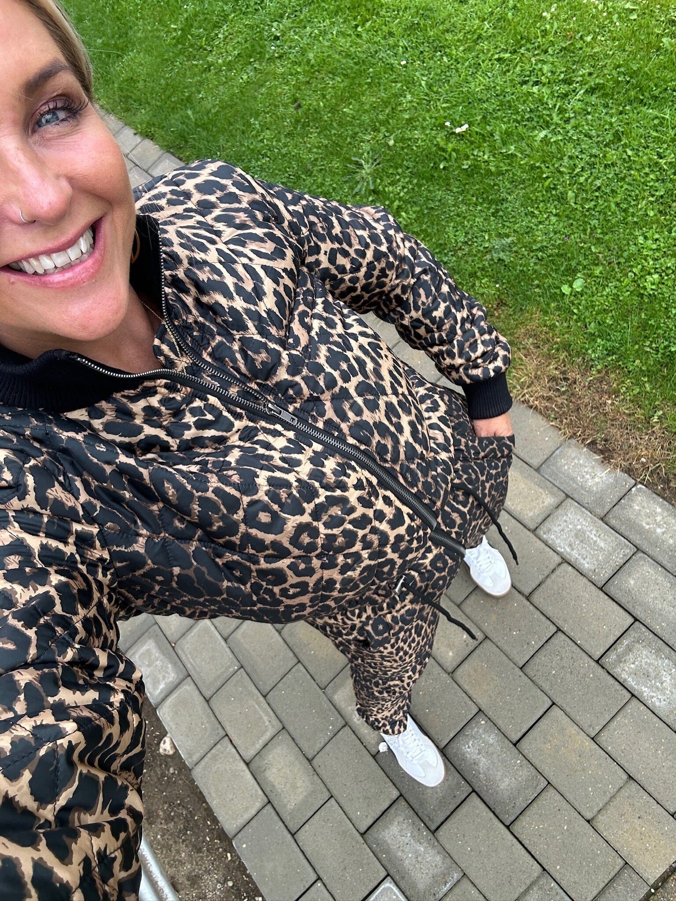 Vaatteet jumpsuit leopardikuosisessa beige, mustassa ja ruskeassa sävyssä. Vaatteen tikattu muotoilu sisältää koristeellisia saumoja, korkean kauluksen ja joustavat hihansuut ja nilkat.